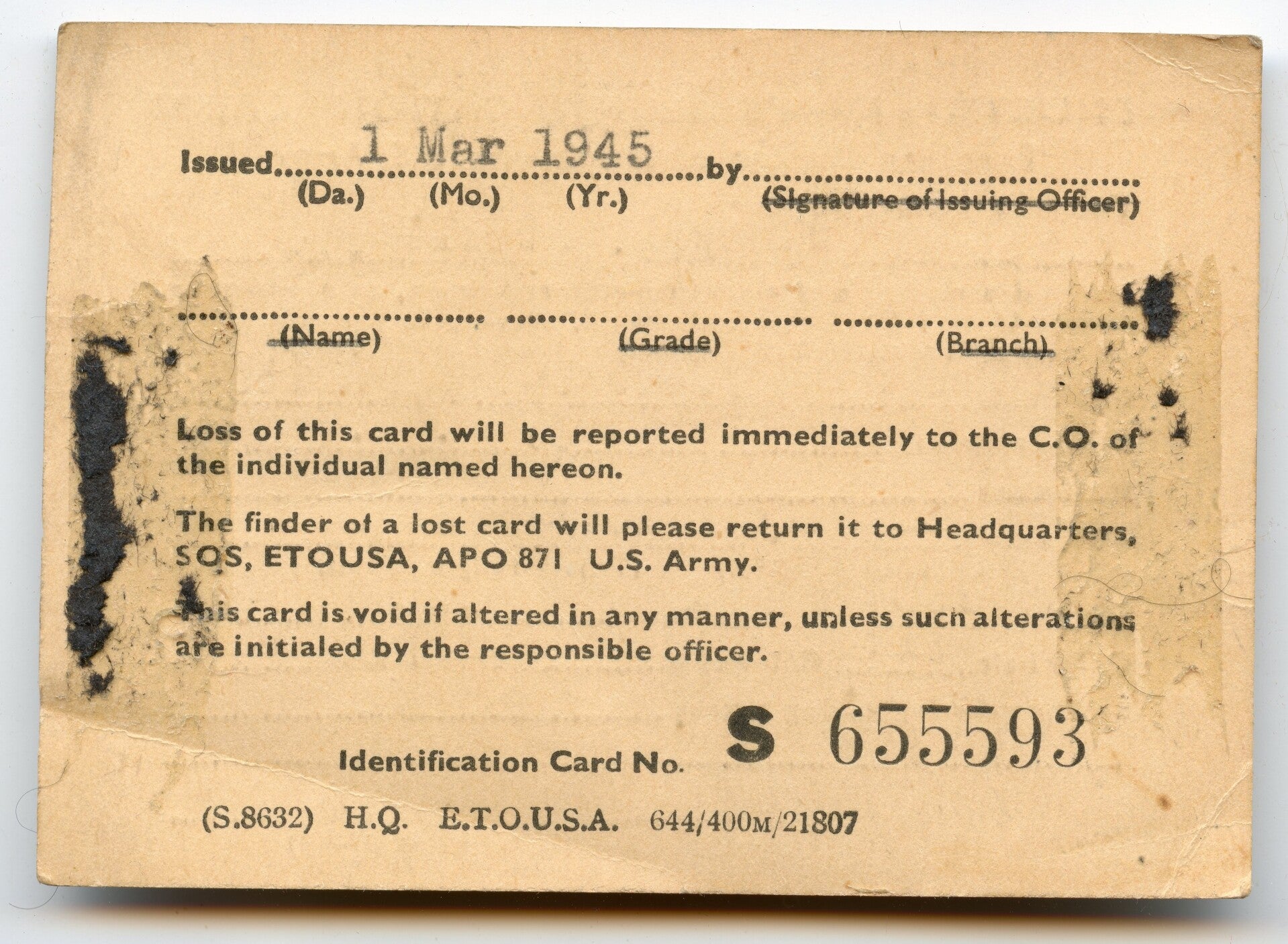 A very nice original WW2 ID'd Purple Heart Medal set. The set consists of Steele's ETO Identification Card, Purple Heart, Good Conduct and Masonic Knights Templar Medal. The medals are not engraved or numbered and come with a period original slot brooch mechanism. They remain in good condition. The group is ID'ed to Tec4 Sidney Lee Steele (34659543) whom served from 29th of June 1943 till 11th of December 1945 with the B Battery of the 980th Field Artillery Battalion of the 7th Army Corps. Steele served in the European Theater of War from the Normandy Campaign until the Ardennes, Rhineland and finally Central Europe Campaign. During his service Steele got wounded (most likely in 1944) resulting in the award of the Purple Heart. The Purple Heart already comes with some research but there is definitely more to find out about Steele's exact service and wounds. Excellent interesting ID'ed Purple Heart Group with lots of further research potential! No repairs, no damage.