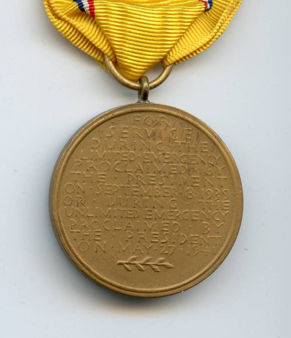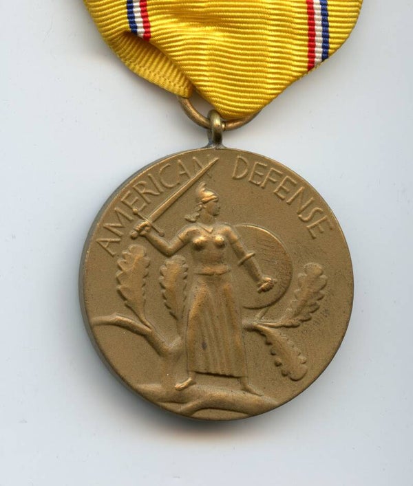 WW2 Original American defense medal. The medal comes with its period original slot brooch mechanism and ribbon. Great medal in excellent worn condition. No repairs, no damage.