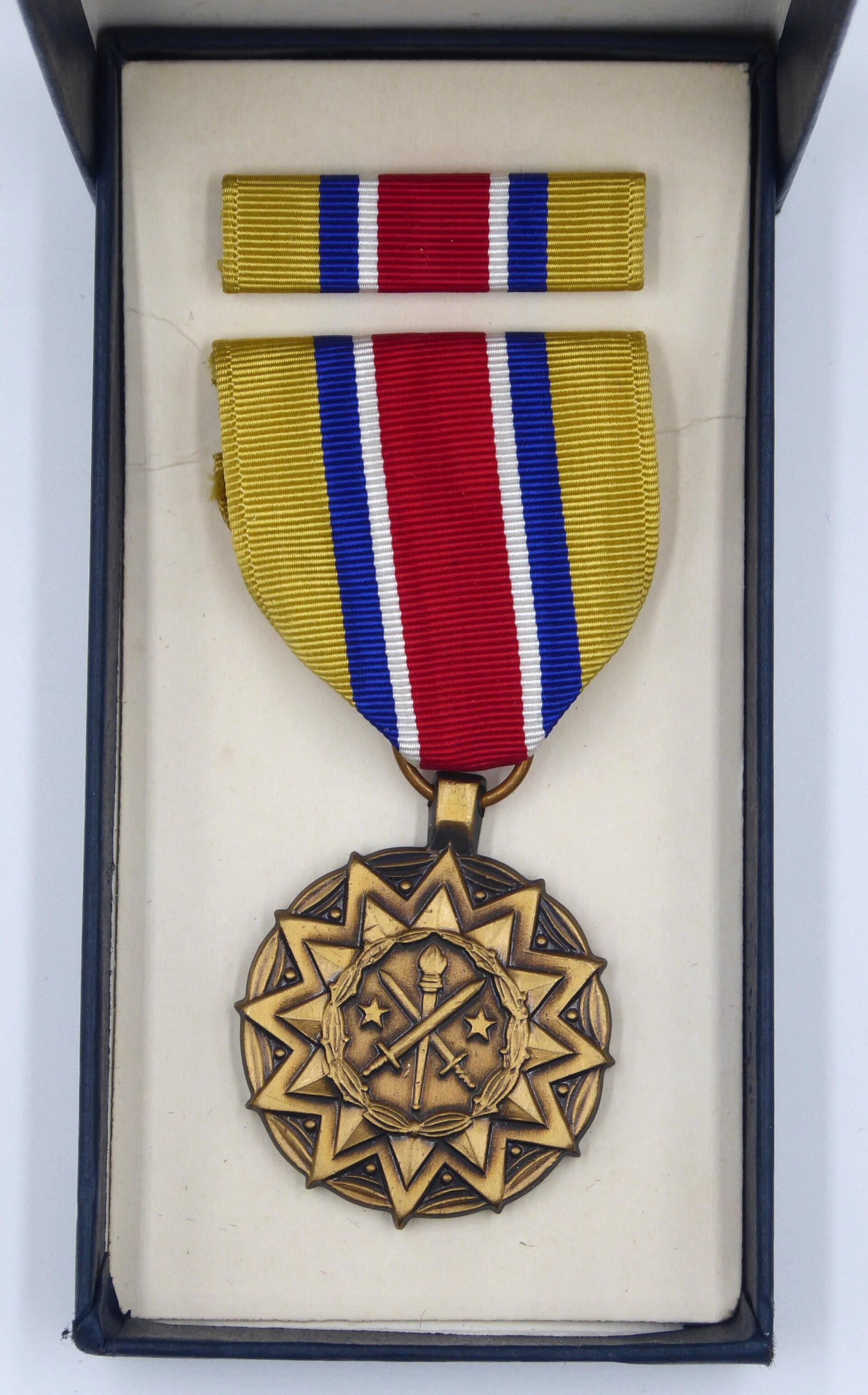An original Vietnam era cased Army Reserve Components Achievement Medal. The medal remains in near mint condition and comes in its original dark blue case of issue together with its original ribbon bar. The medal contains the period original crimp brooch mechanism. The set was produced in 1972. Great set in near mint condition! No repairs, no damage.