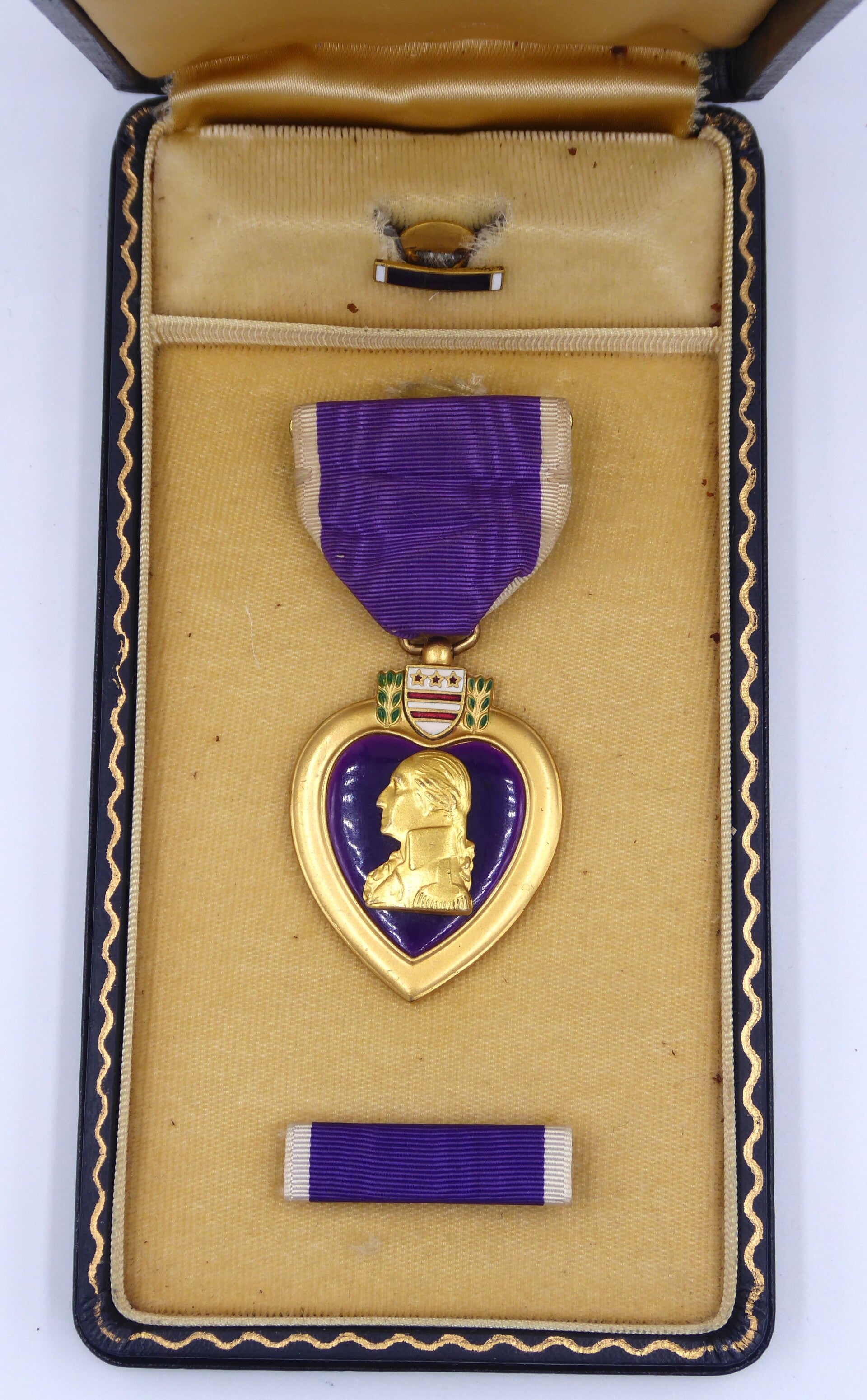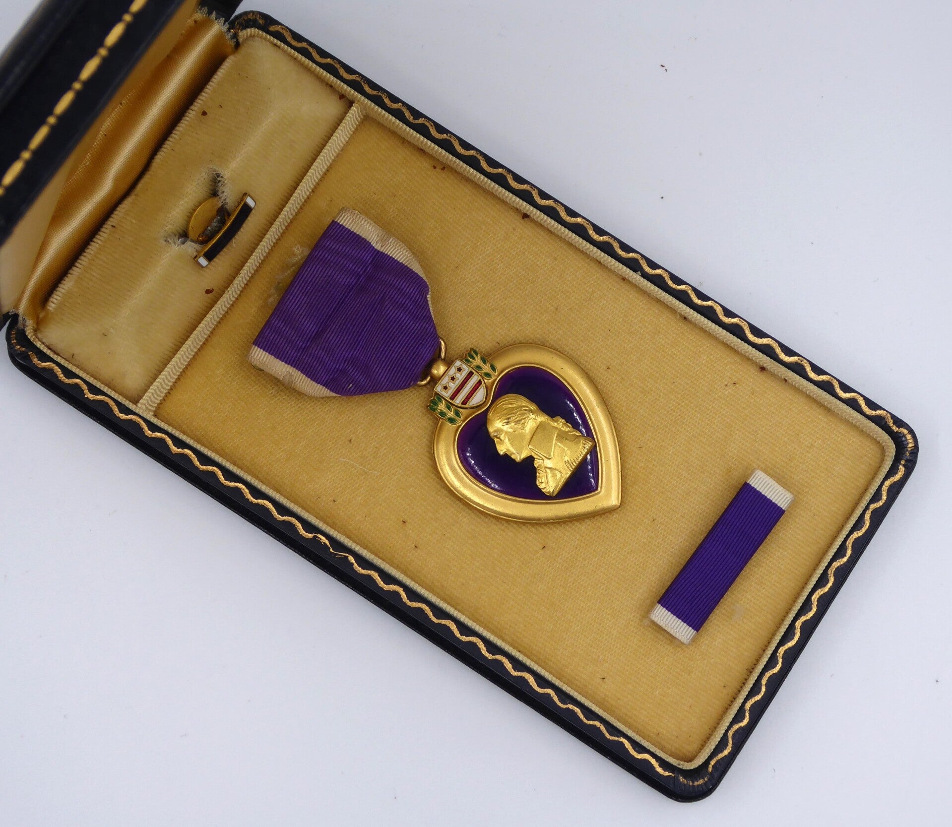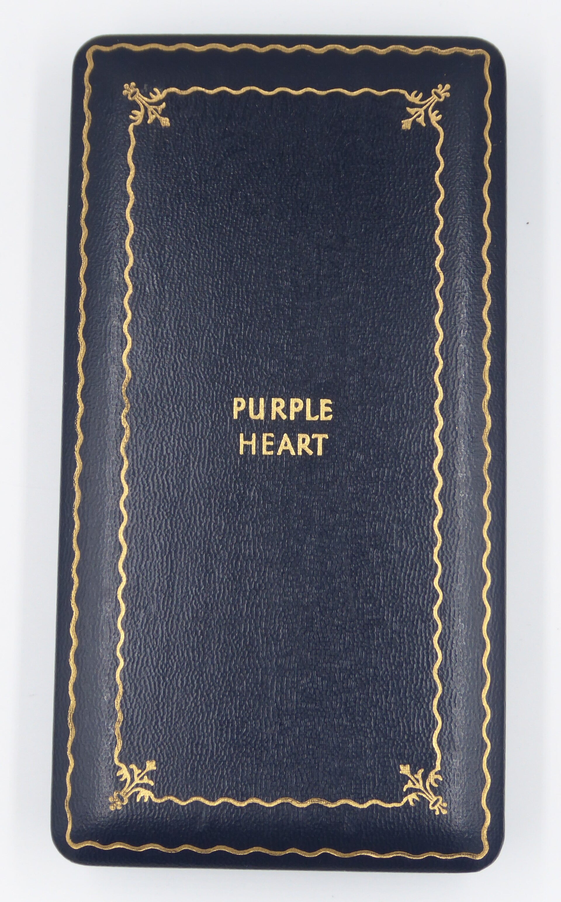 An original complete WW2 cased Purple Heart medal. The medal comes in its original case of issue together with its ribbon bar and lapel pin. The medal comes with a slot brooch, indicating production during WW2. Great set in great condition! No repairs, no damage.