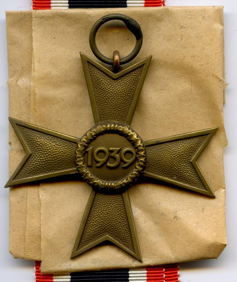 Nice and complete KVK 2nd Class without Swords by Deschler & Sohn, München. Buntmetall construction. The medal is marked on the ring with PKZ code "1" indicating production by D&S. Nice cross in mint unissued condition, comes with its original long ribbon, wrapping paper and maker marked package. This cross originates from the famous "Deschler Hoard". Nice original complete set with mint cross! No repairs, no damage.