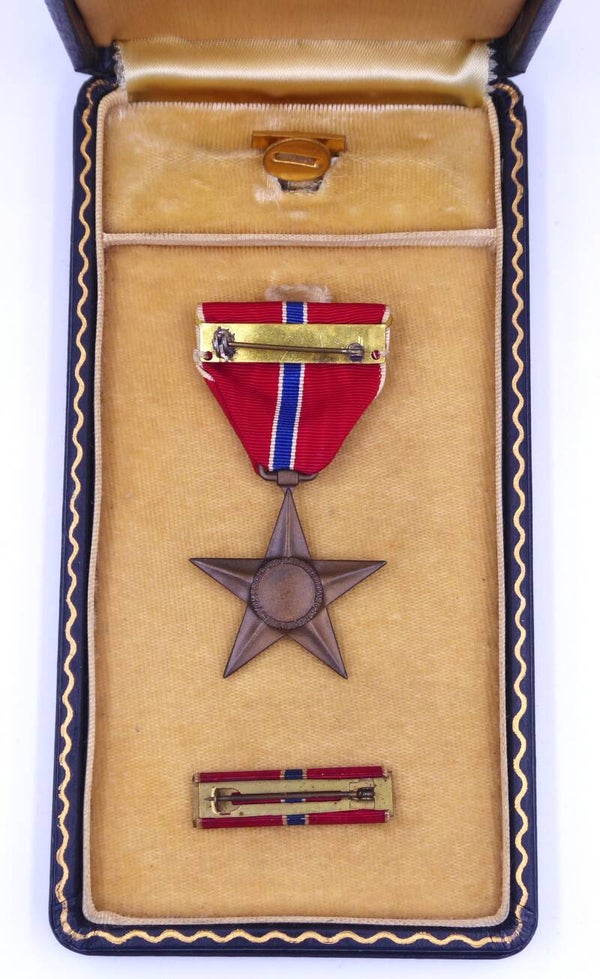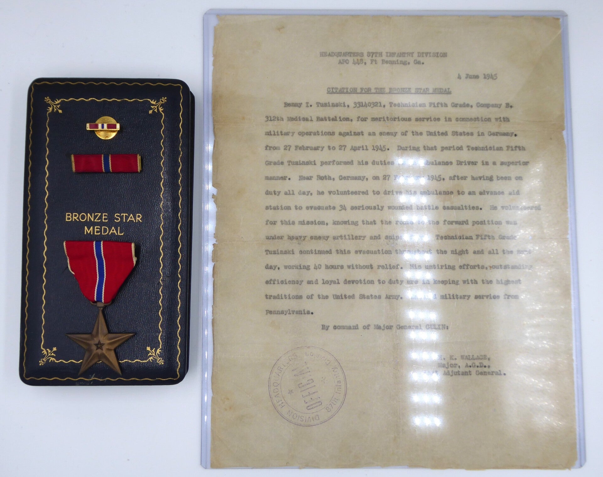 An original WW2 ID'ed cased Bronze Star medal with Citation. The medal comes in its original case of issue together with its ribbon bar. The medal comes with a slot brooch mechanism and its original ribbon, indicating production during WW2. The Bronze Star is ID'ed and awarded to Benny I. Tuzinski (33140321). Tuzinski was a Technician 5th Grade with Company B of the 312th Medical Battalion of the 87th Infantry Division. The set comes with the original citation for Tuzinskis Bronze Star and notes that he received his Bronze Star for: