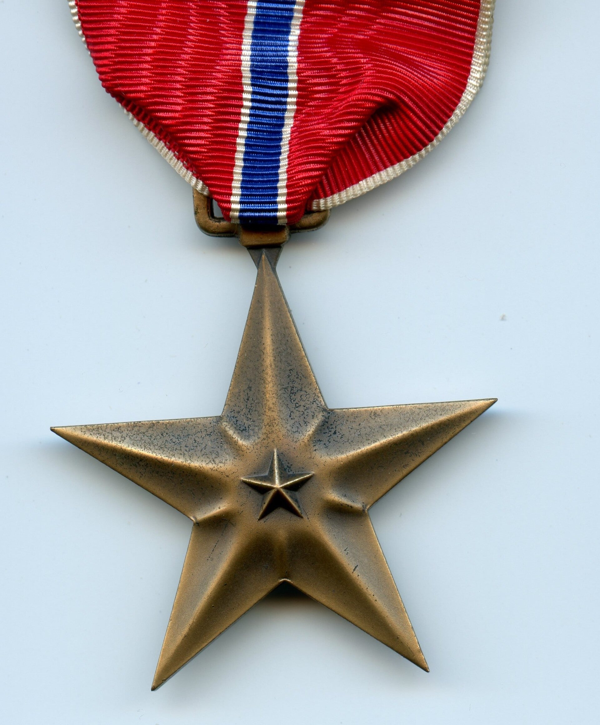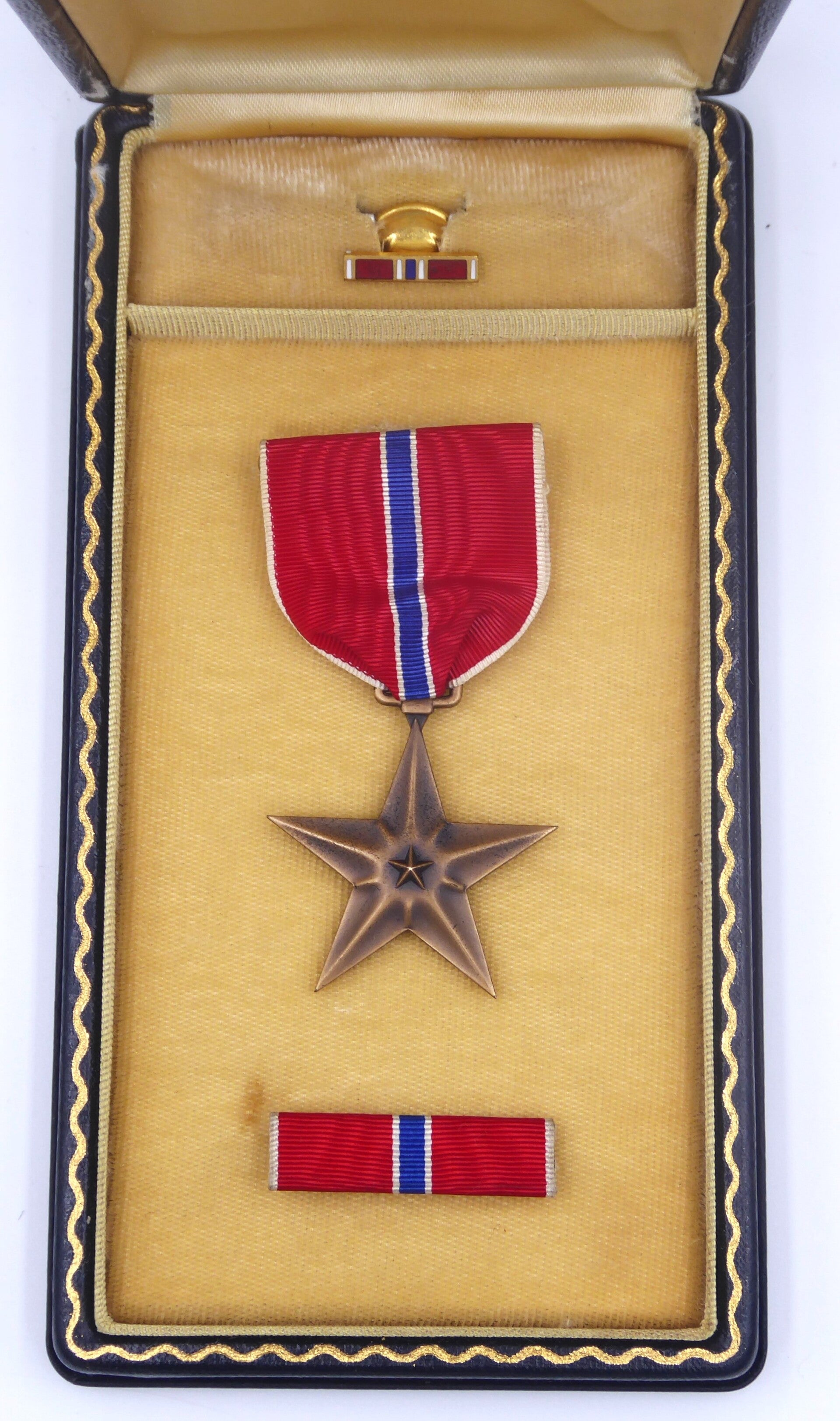An original complete WW2 named cased Bronze Star medal. The medal comes in its original case of issue together with its ribbon bar and lapel pin. The medal comes with a slot brooch mechanism and its original ribbon, indicating production during WW2. The Bronze Star is hand engraved with "George J. Nardone".