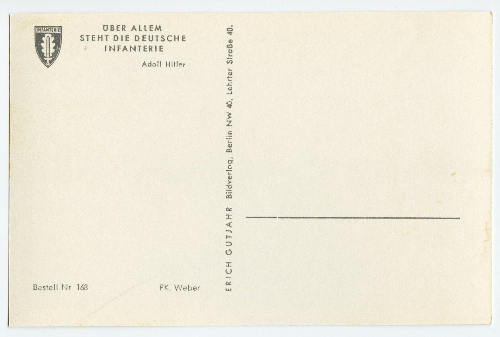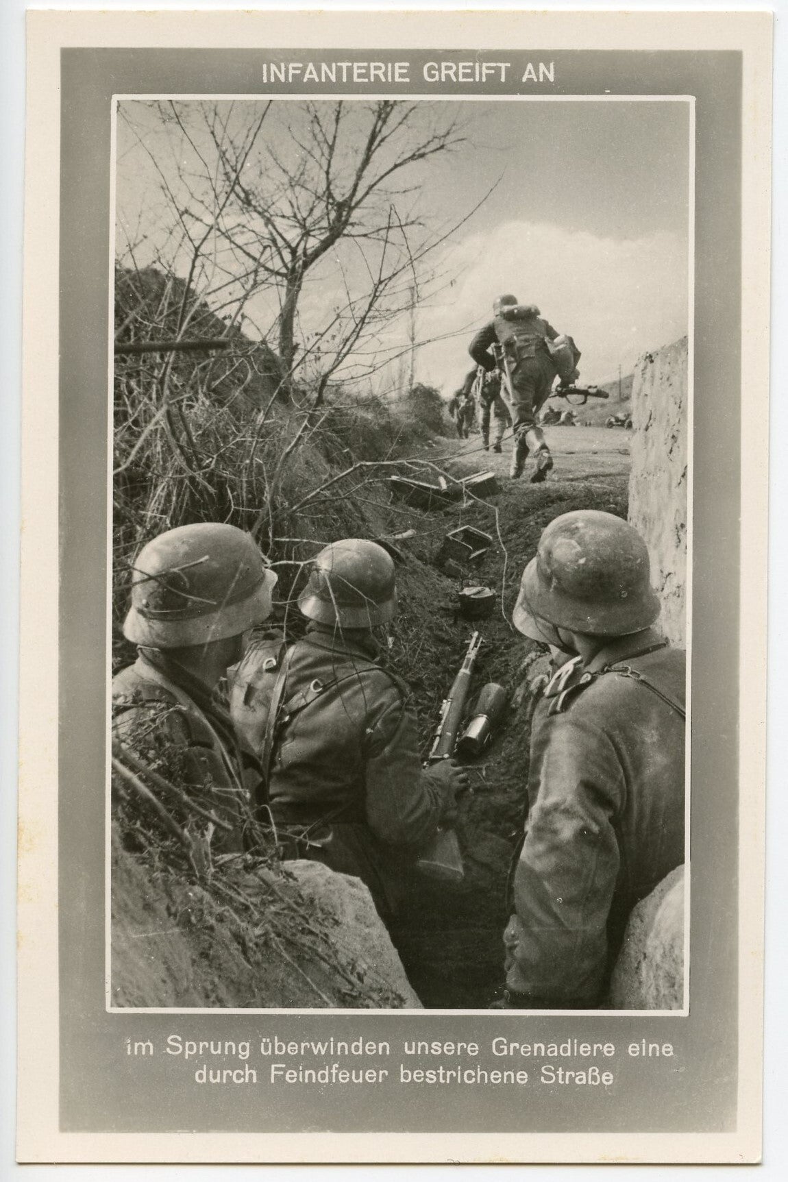 Nice 'Infanterie Greift An' postcard number 168. The postcard is from the "Über allem steht die Deutsche Infanterie" series. Under the photo is written: 'im Sprung überwinden unsere Grenadiere eine durch Feindfeuer bestrichene Strasse'. The photo was taken by Kriegsberichter Weber and published by 'Erich Gutjahr Bildverlag' from Berlin. Very nice postcard in excellent unsent condition and measures approximitely 14 x 9 cm in size. No repairs, no damage.