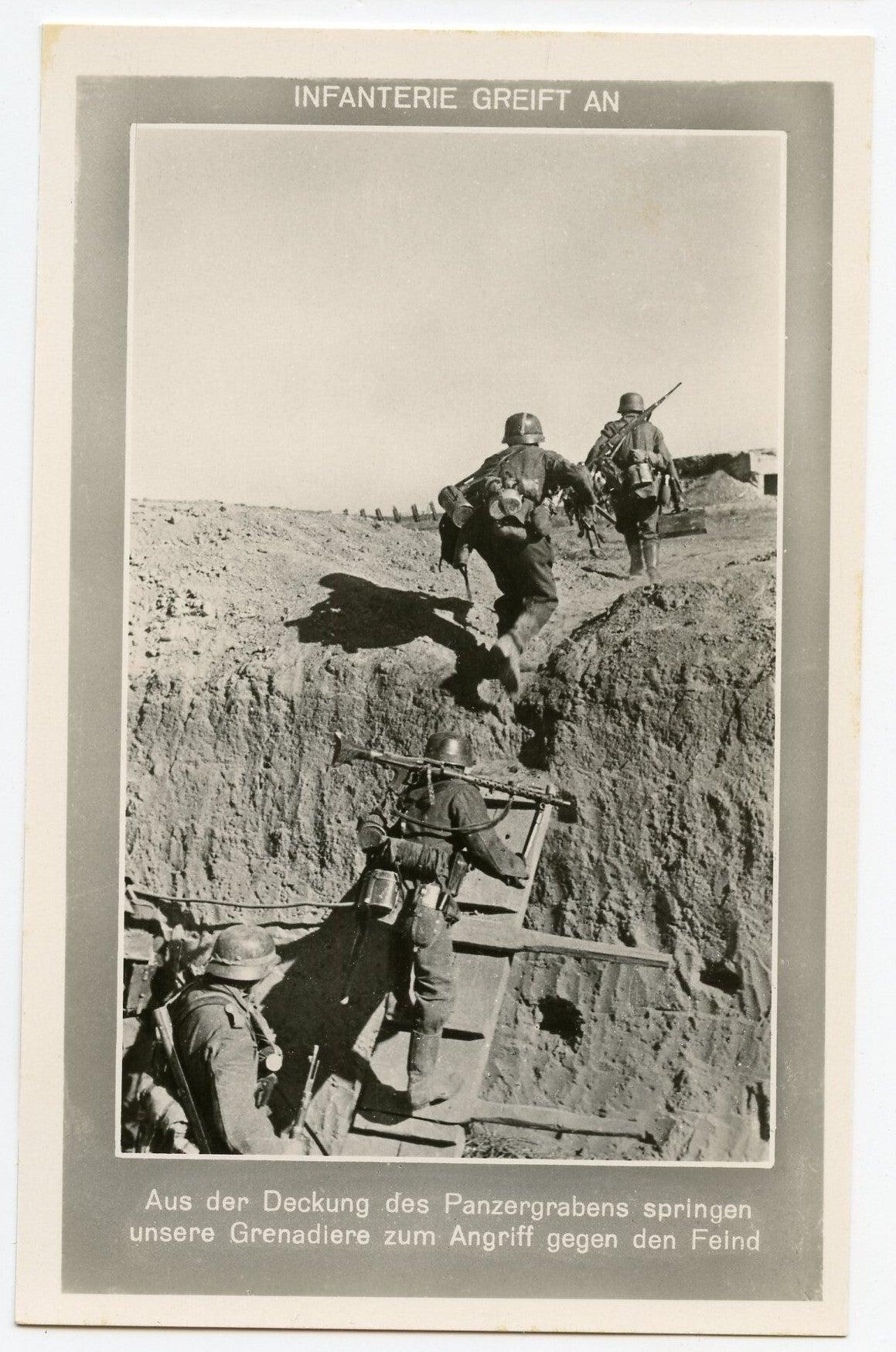 Nice 'Infanterie Greift An' postcard number 168. The postcard is from the "Über allem steht die Deutsche Infanterie" series. Under the photo is written: 'Aus der Deckung des Panzergrabens springen unsere Grenadiere zum Angriff gegen den Feind'. The photo was taken by Kriegsberichter Weber and published by 'Erich Gutjahr Bildverlag' from Berlin. Very nice postcard in excellent unsent condition and measures approximitely 14 x 9 cm in size. No repairs, no damage.