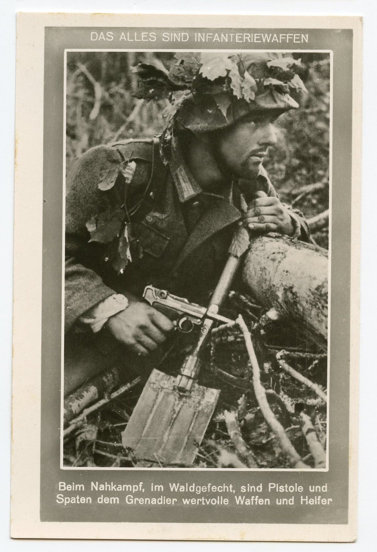 Nice 'Das Alles Sind Infanteriewaffen' postcard number 151. The postcard is from the "Über allem steht die Deutsche Infanterie" series. Under the photo is written: 'Beim Nahkampf, im Waldgefecht, sind Pistole und Spaten dem Grenadier wertvolle Waffen und Helfer'. The photo was taken by Kriegsberichter Kraayvanger and published by 'Erich Gutjahr Bildverlag' from Berlin. Very nice postcard in excellent unsent condition and measures approximitely 14 x 9 cm in size. No repairs, no damage.