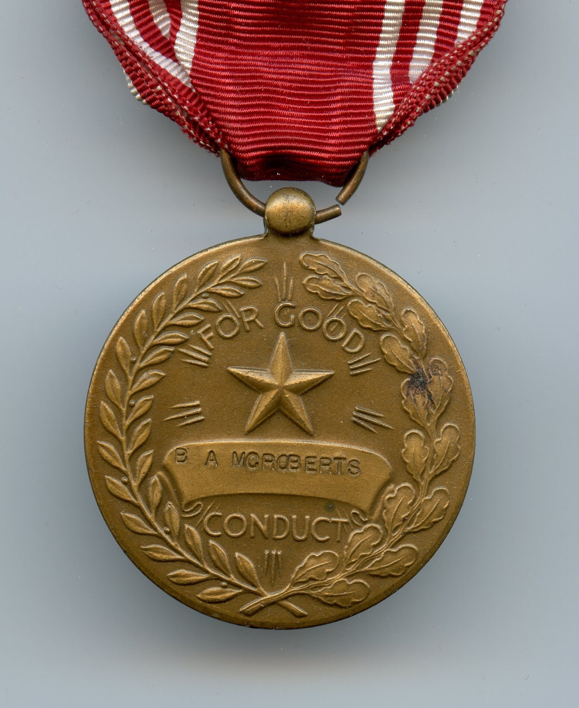 WW2 original Named Good Conduct Medal. The medal remains in good condition. The medal has a slot brooch mechanism and is government engraved to "B A McRoberts". Nice engraved medal with research potential! No repairs, no damage.