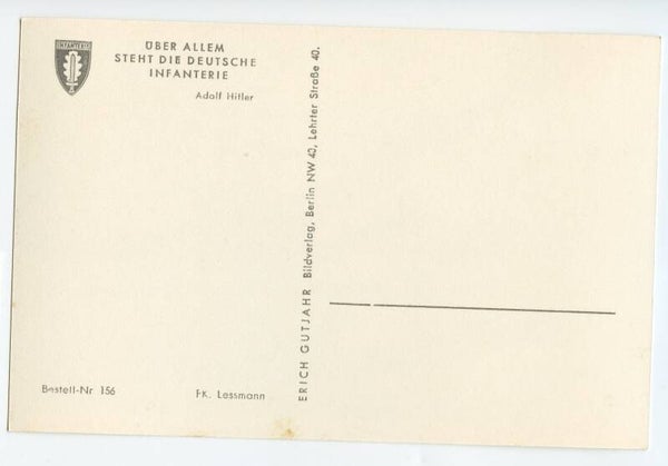 Nice 'Das Alles Sind Infanteriewaffen' postcard number 156. The postcard is from the "Über allem steht die Deutsche Infanterie" series. Under the photo is written: 'Das Zwillings-M.G. ist die eigene Flieger-Abwehr des Infanterie-Batallions'. The photo was taken by Kriegsberichter Lessmann and published by 'Erich Gutjahr Bildverlag' from Berlin. Very nice postcard in excellent unsent condition and measures approximitely 14 x 9 cm in size. No repairs, no damage.