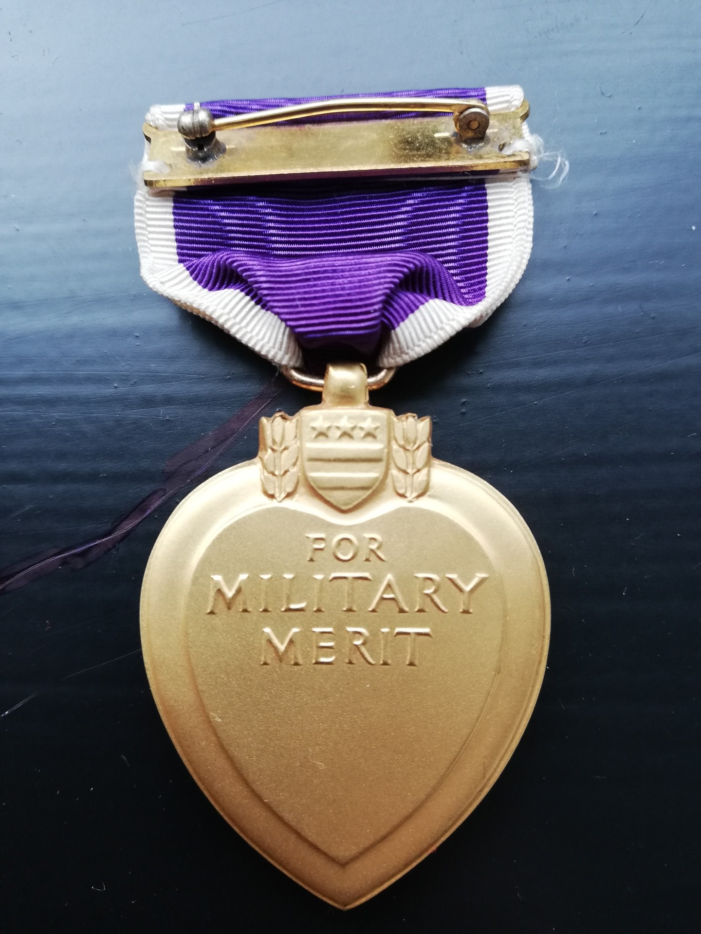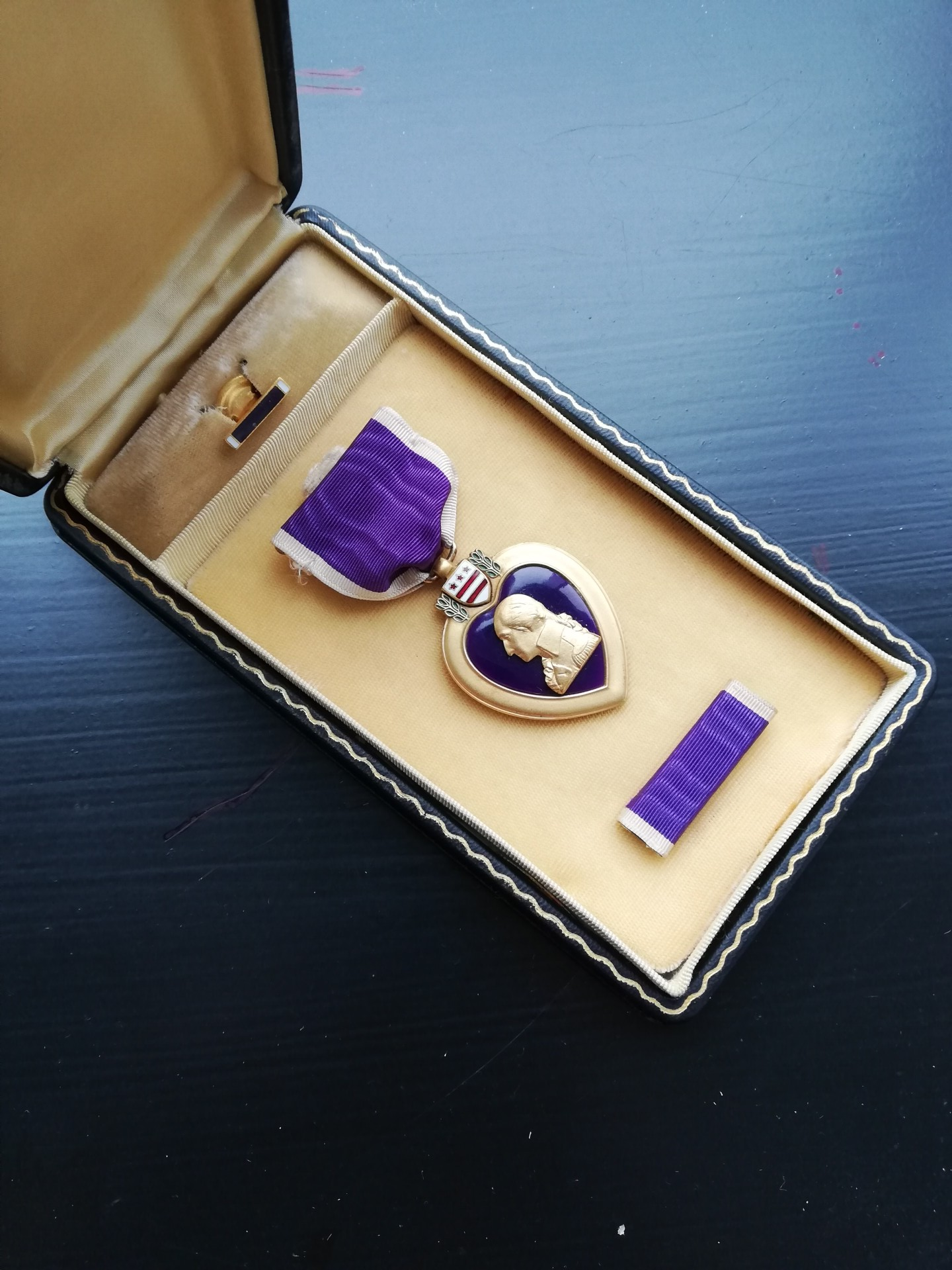 An original complete WW2 cased Purple Heart medal. The medal comes in its original case of issue together with its ribbon bar and lapel pin. The medal comes with a slot brooch, indicating production during WW2. Great set in great condition! No repairs, no damage.