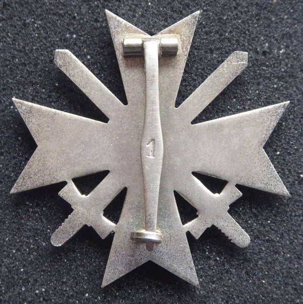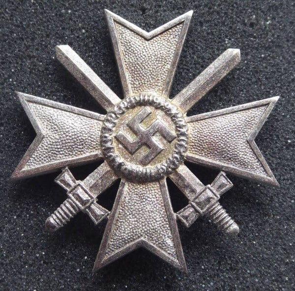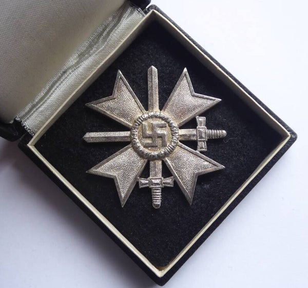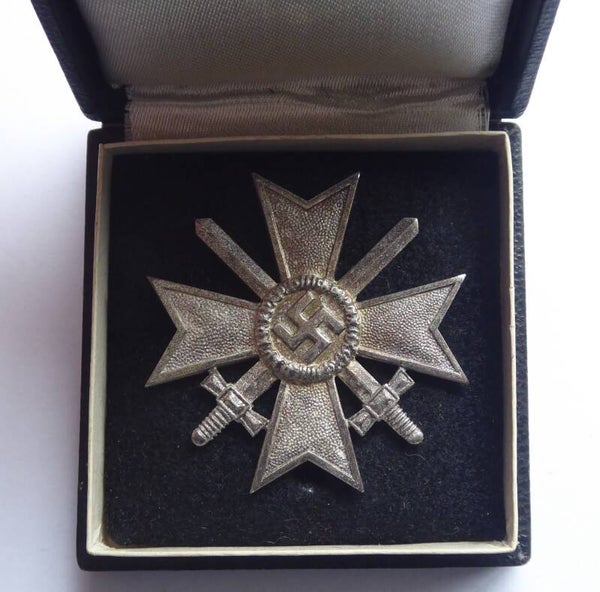 Nice Cased War Merit Cross (KVK) 1st class with Swords produced by Deschler & Sohn, München. The cross is of tombac construction with soldered on set up. The cross is maker marked on the pin with PKZ code "1" indicating production by Deschler. The cross remains in an excellent condition and comes within its original black case. The case shows some slight signs of age but remains in excellent condition. Excellent cased KVK set! No repairs, no damage.