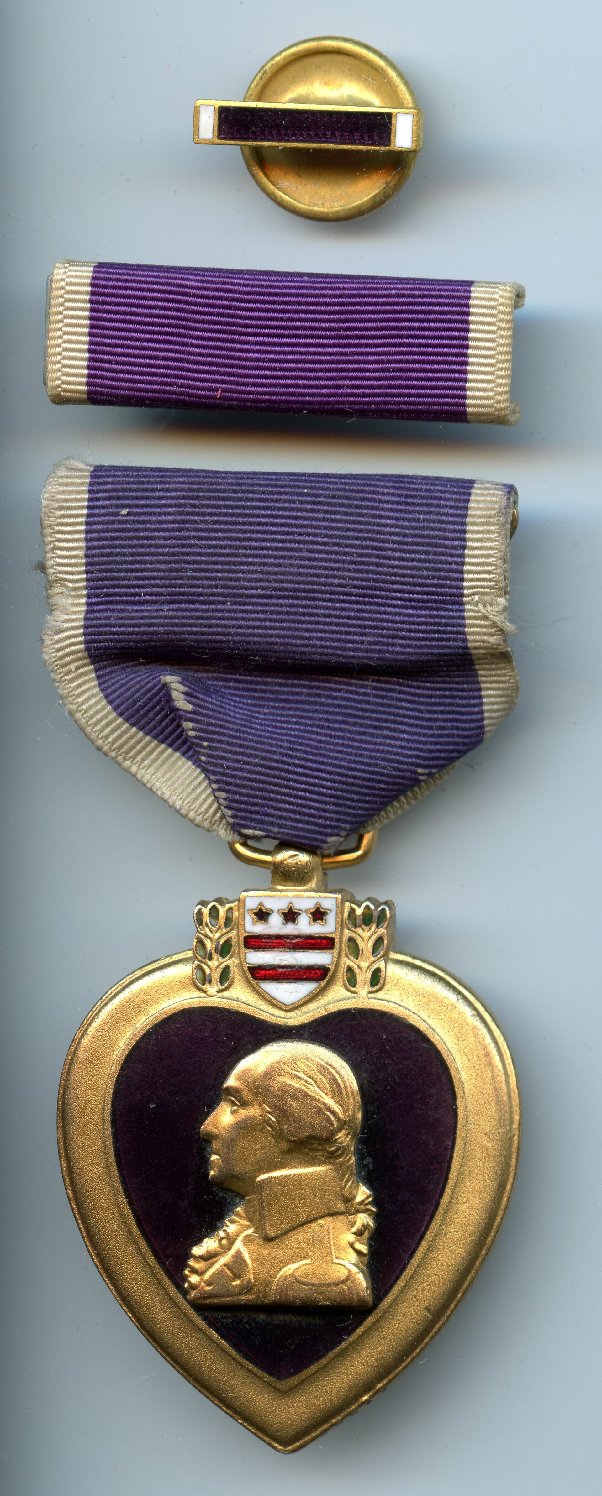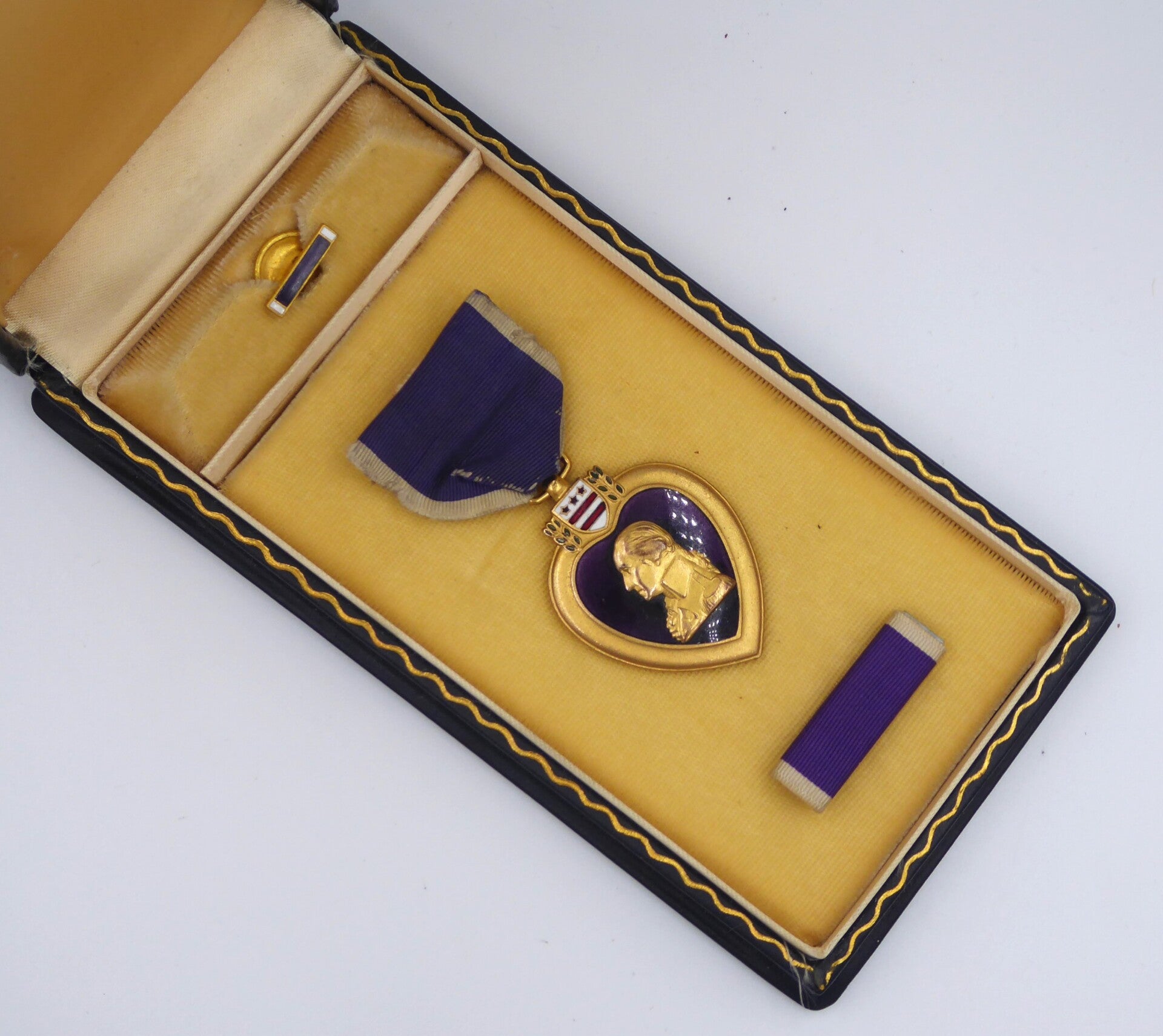 An original complete WW2 numbered cased Purple Heart medal. The medal comes in its original case of issue together with its lapel pin and ribbon bar. The medal comes with a slot brooch mechanism, and is numbered on the right rim with "95373" indicating the Purple Heart was produced in 1941 by the The Robbins Company. The medal, ribbon bar and lapel pin are in excellent condition. The case remains in a lightly used condition. Excellent hard to find set in great condition! No repairs, no damage.