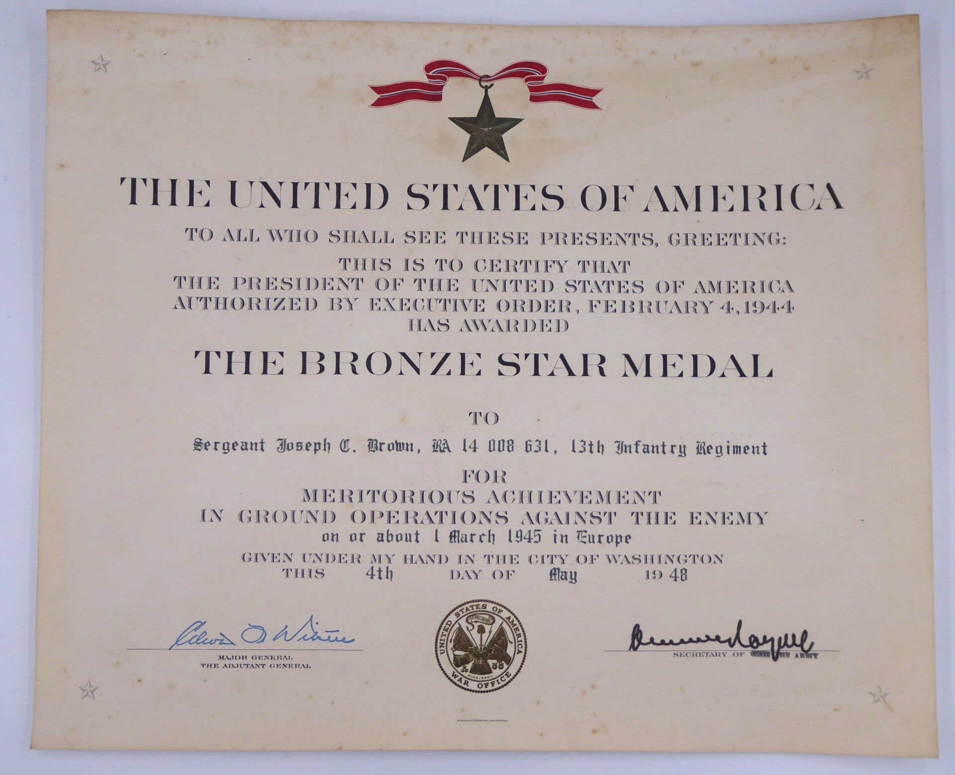- WW2 Bronze Star Award Certificate named to Sergeant Joseph C Brown and awarded in 1948 for actions on or about the 1st of March 1945.