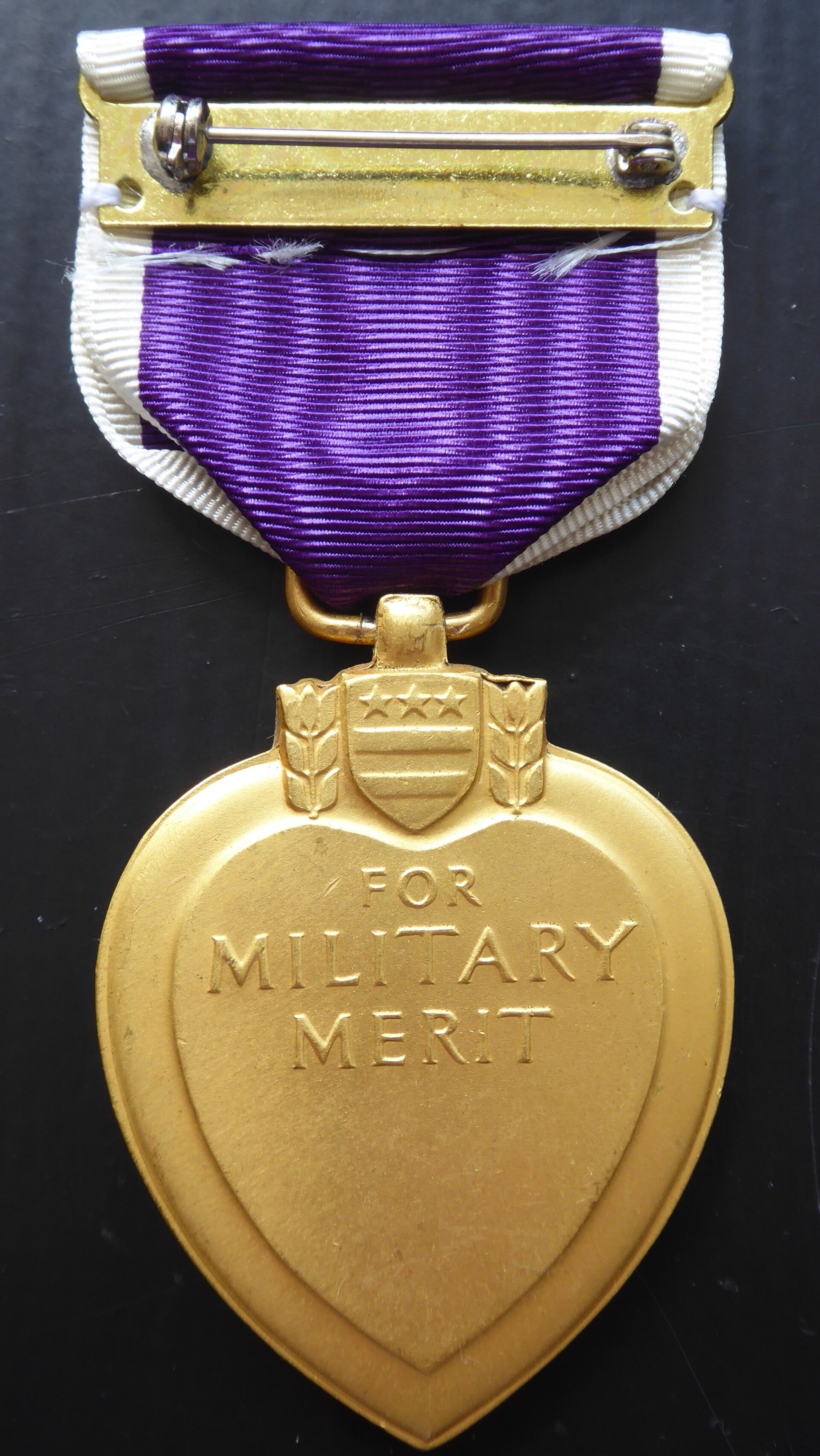 An original complete WW2 cased Purple Heart medal. The medal comes in its original case of issue together with its ribbon bar and lapel pin. The medal comes with a slot brooch, indicating production during WW2. Great set in great condition! No repairs, no damage.