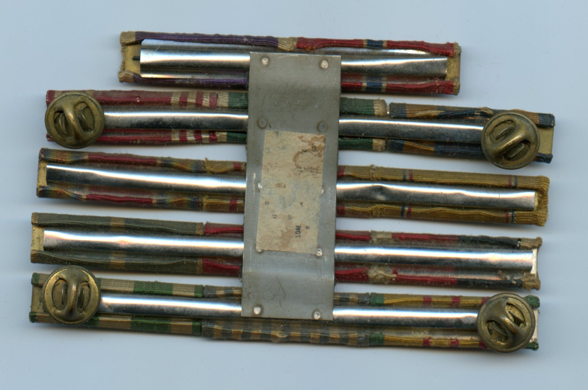 Nice WW2/Korea/Vietnam War US 15 Piece Ribbon Bar for the Bronze Star, Purple Heart, Air, Army Commendation, Army Good Conduct, American Defense, Asiatic Pacific Campaign, WW2 Victory, Occupation, National Defense, Korean Service, Vietnam Service, United Nations Service and Vietnam Campaign Medals. The ribbon bar remains in a good heavily worn condition and comes with a valor device and 2 oakleafs for the Bronze Star Medal, 2 oakleafs for the Purple Heart Medal, 3 oakleafs/numeral for the Air Medal, 1 oakleaf for the Army Commendation Medal, 4 bronze loops for the Army Good Conduct Medal, 1 oakleaf for the National Defense Medal, 3 battle stars for the Vietnam Service Medal and a 1960s device for the Vietnam Campaign Medal. Excellent interesting ribbon bar with some hard earned devices on it! No repairs, no damage.