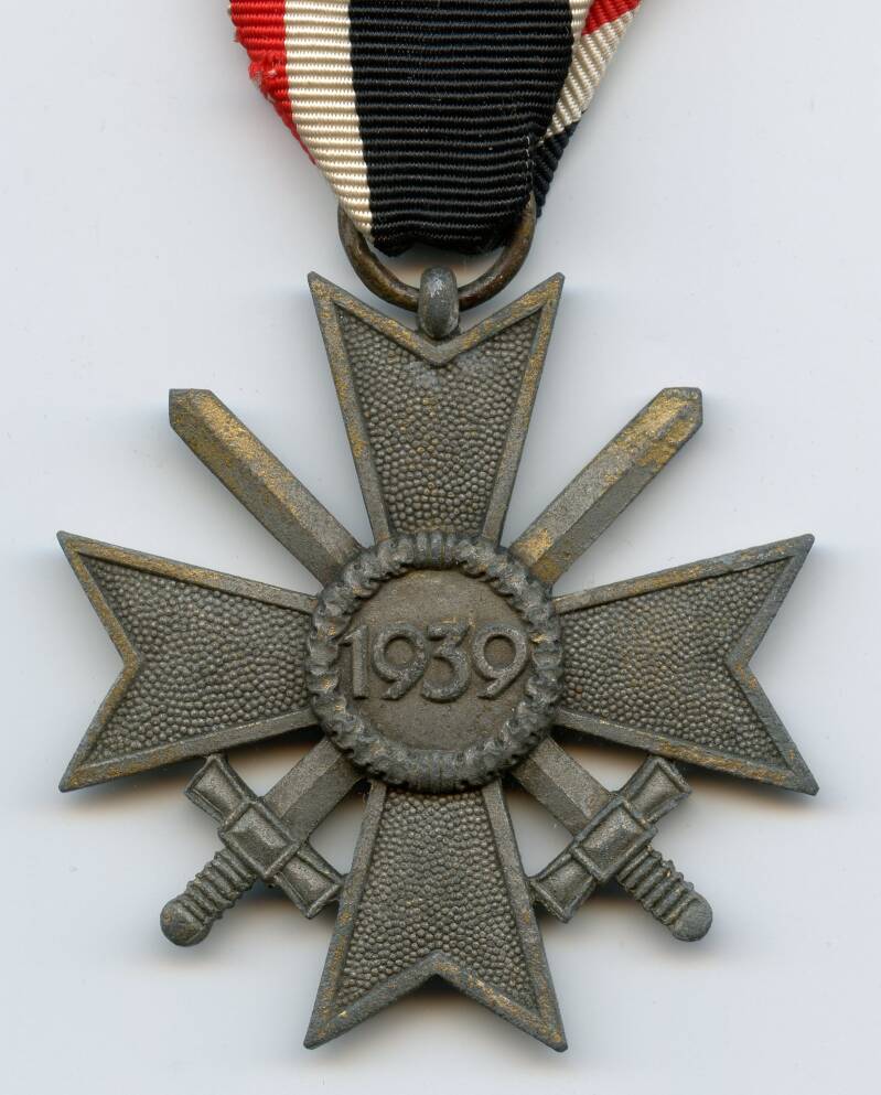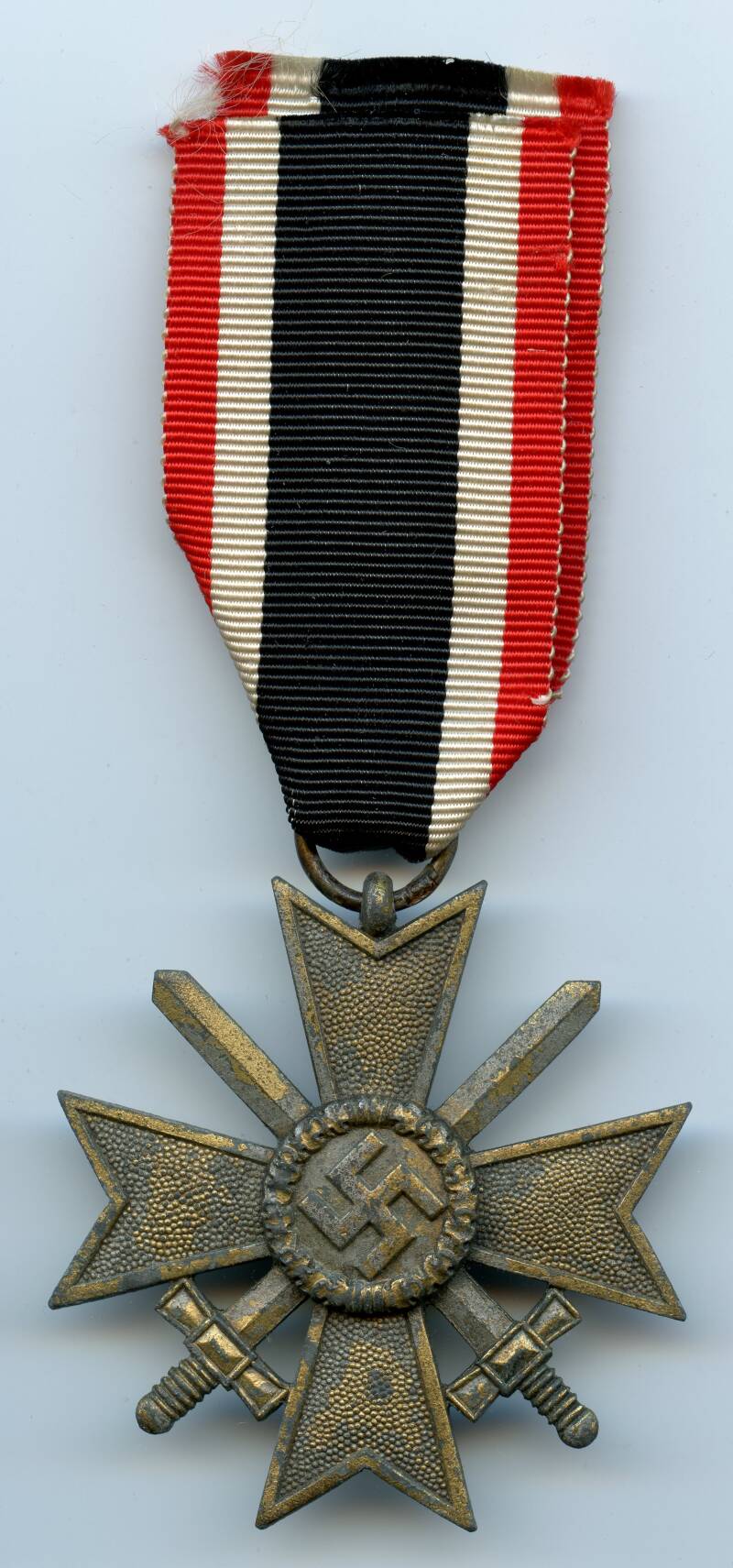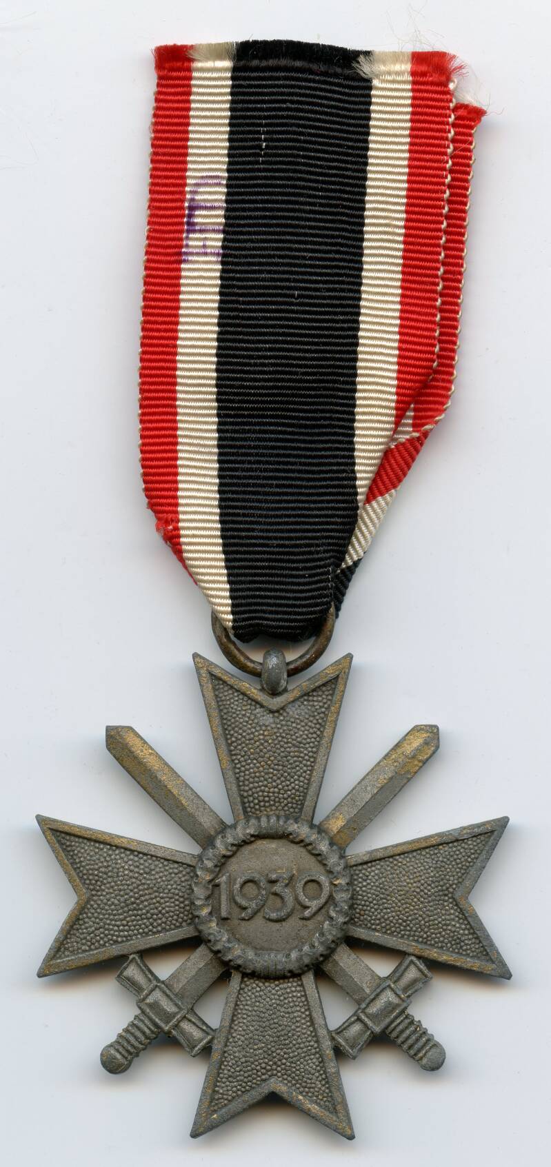Nice KVK 2nd Class with Swords produced by Hermann Aurich, Dresden. Zinc construction. The cross is marked on the ring with "113" indicating production by Aurich. Nice cross in good condition, comes with its original ribbon. Great cross! No repairs, no damage.