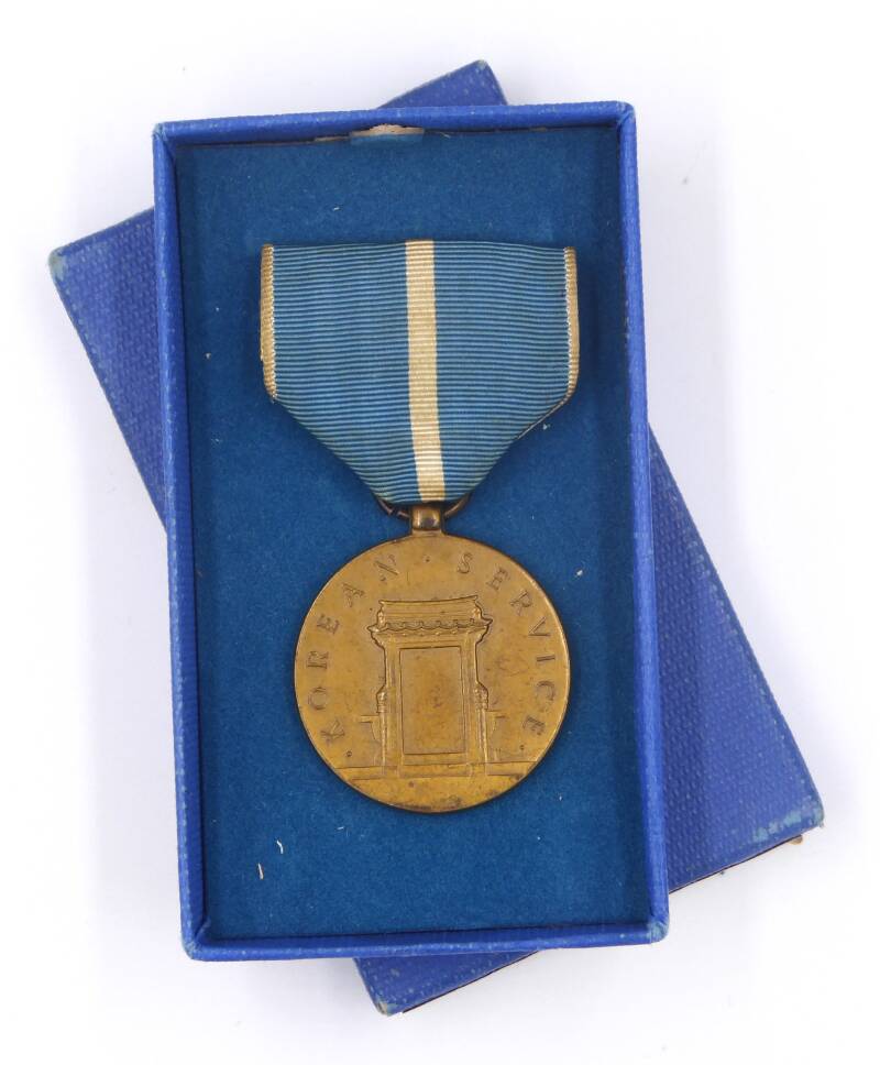 Nice original Post WW2 Cased Korea Service Medal. The service medal comes in its original blue box of issue. The medal remains in an excellent condition. The medal contains the period original crimp brooch mechanism. Excellent set! No repairs, no damage.