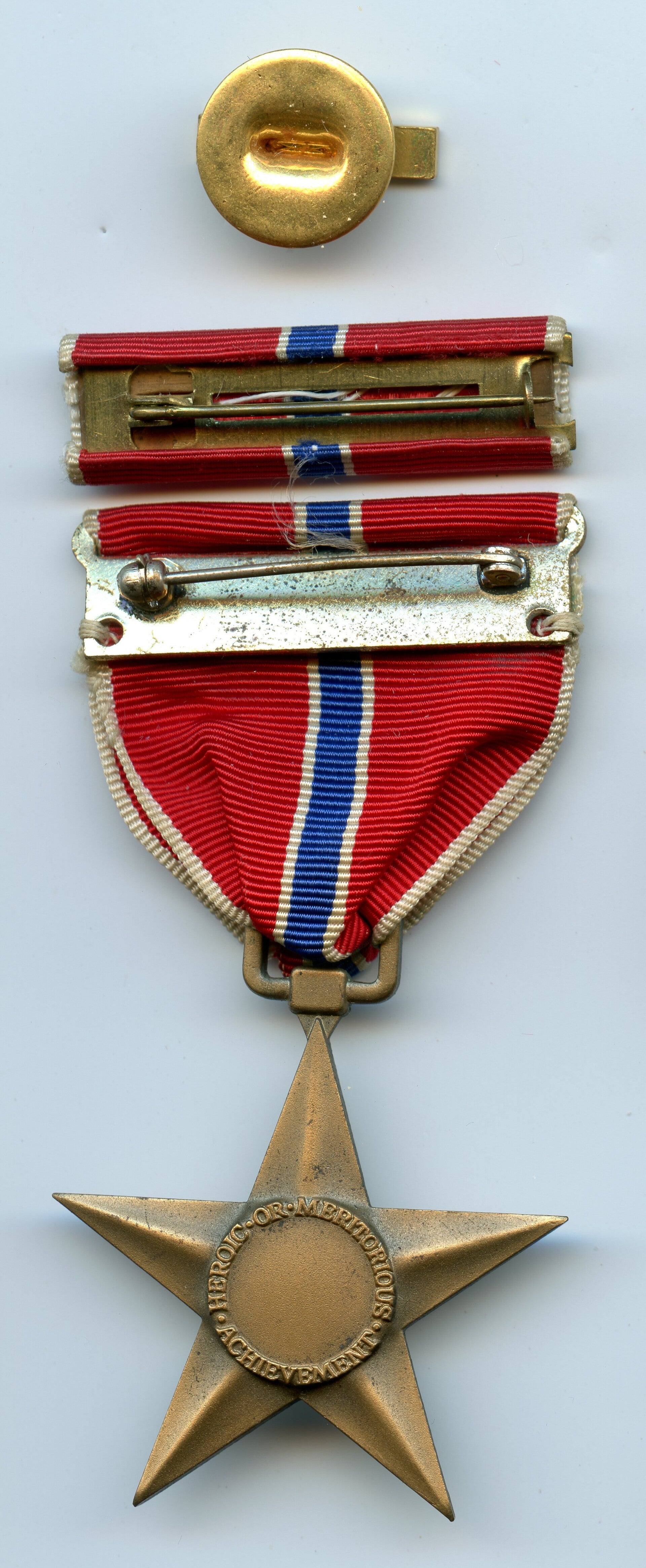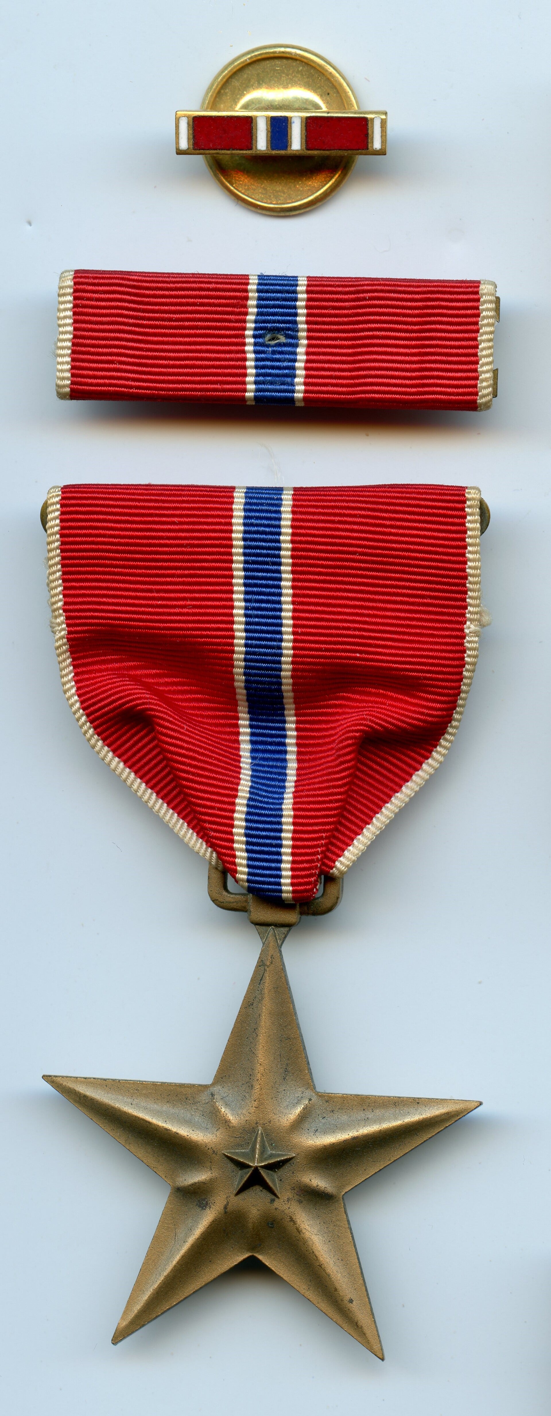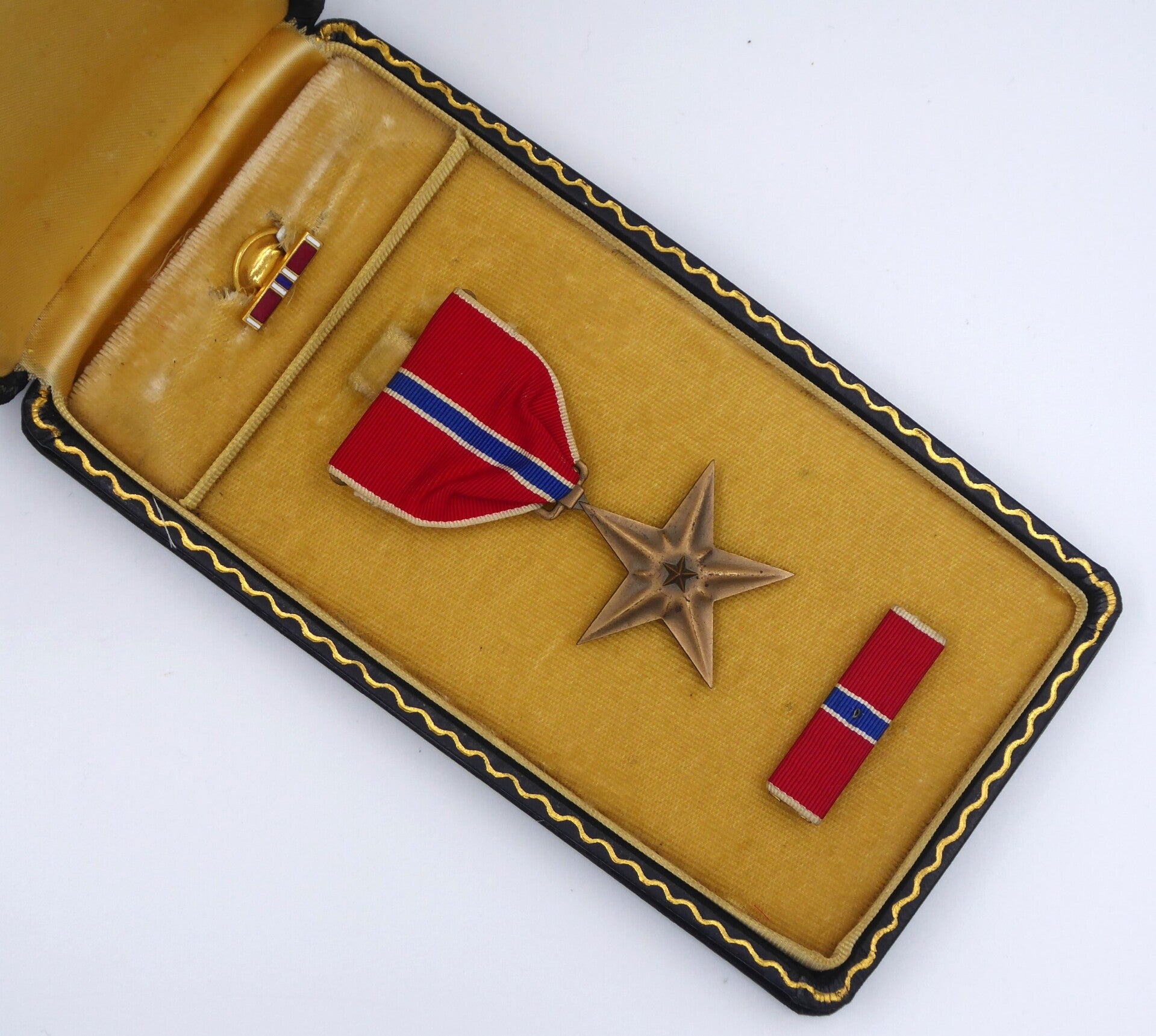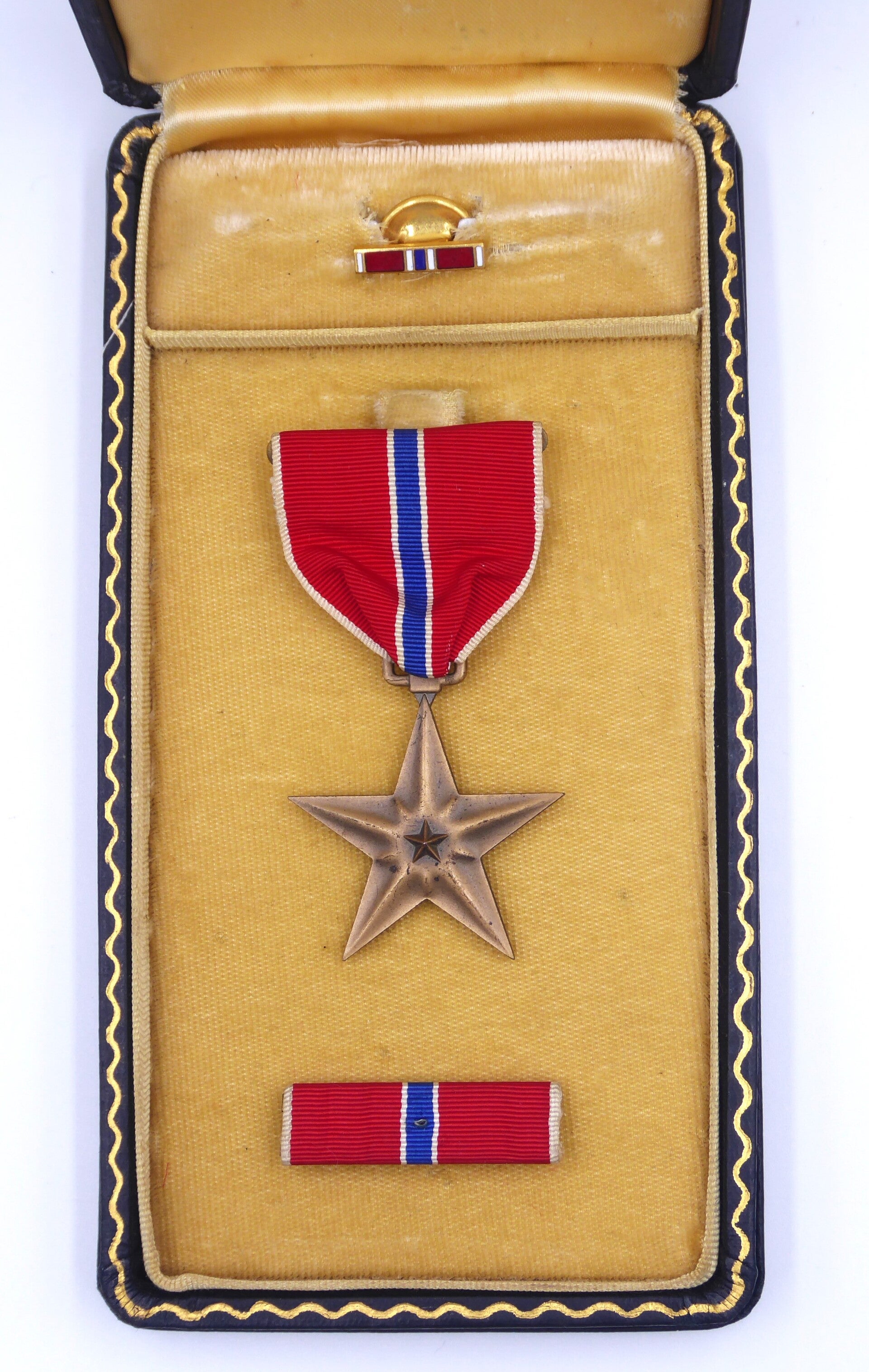 An original complete WW2 cased Bronze Star medal. The medal comes in its original metal case of issue together with its ribbon bar and lapel pin. The medal comes with a slot brooch mechanism and its original ribbon, indicating production during WW2. Great set in good condition! No repairs, no damage.