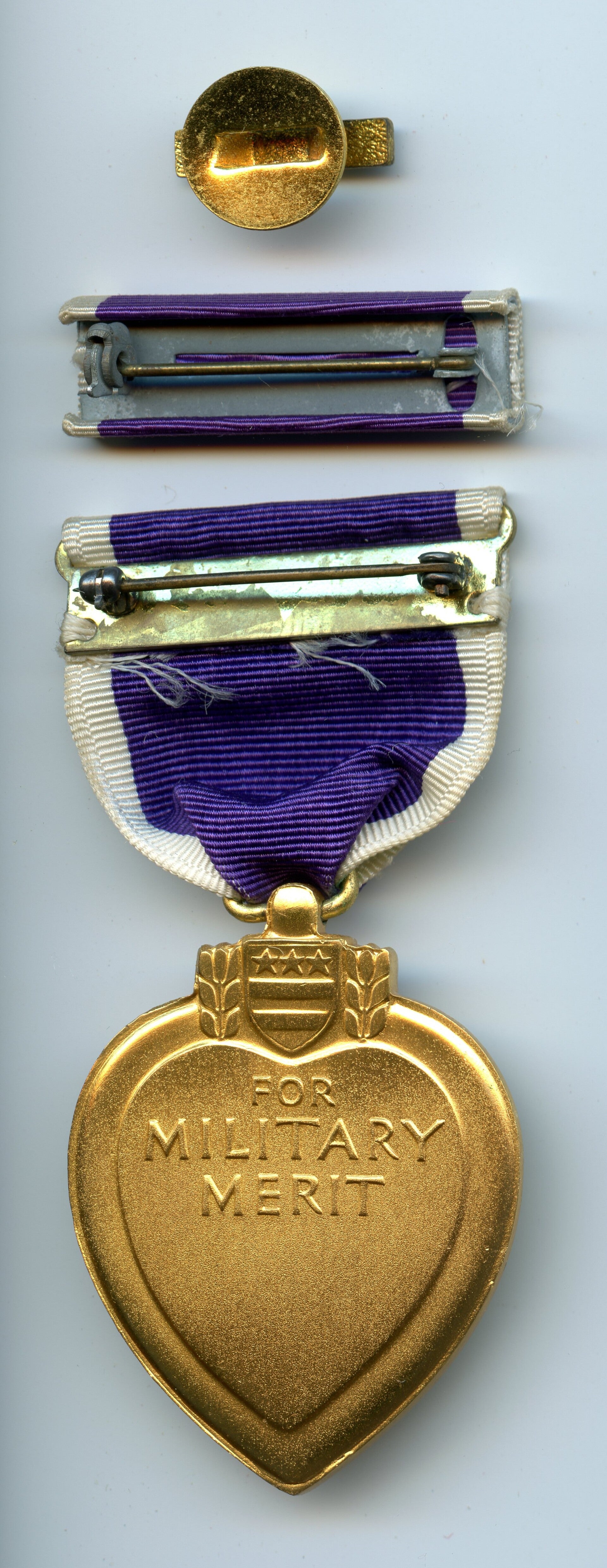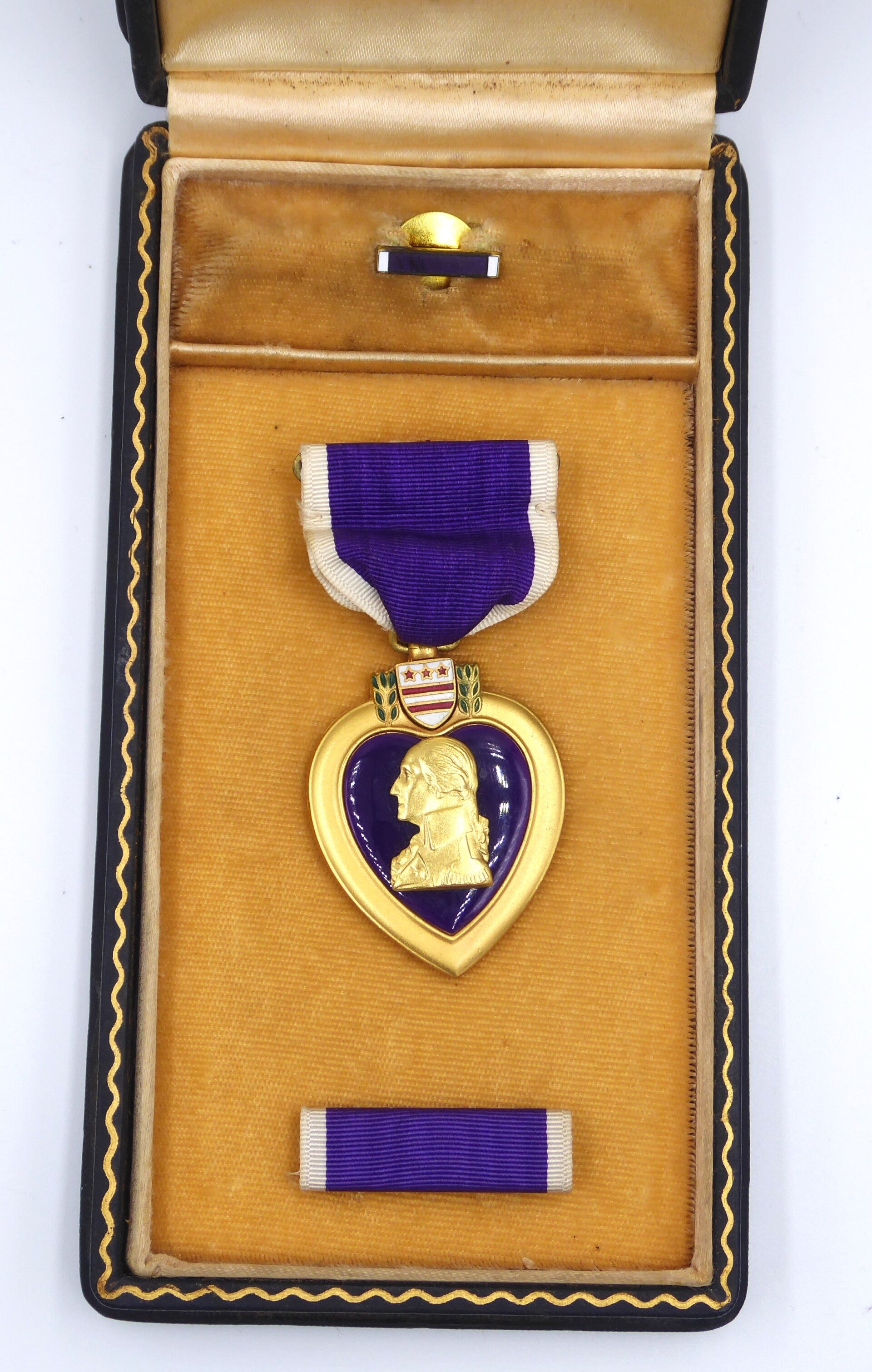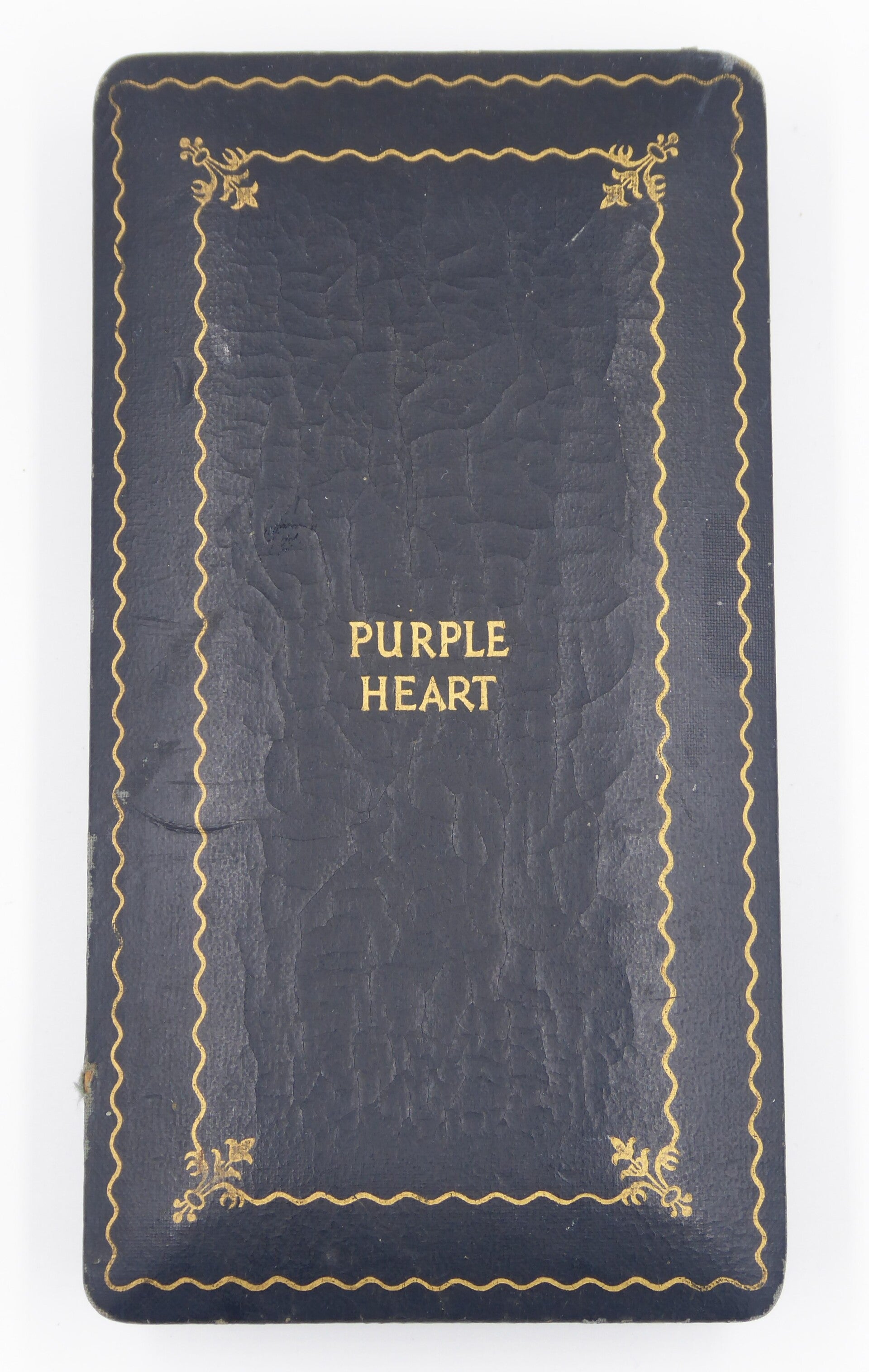 An original complete WW2 cased Purple Heart medal. The medal comes in its original wooden case of issue together with its ribbon bar and lapel pin. The medal comes with a slot brooch, indicating production during WW2. Great set in great condition! No repairs, no damage.