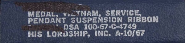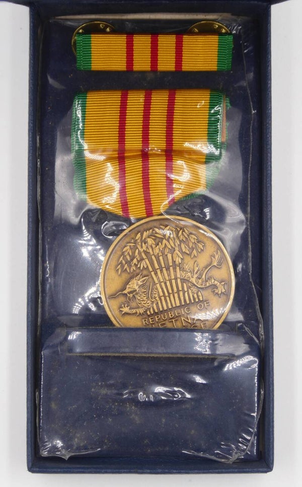 Nice original and complete Vietnam era Cased Vietnam Service Medal with ribbon bar. The set was produced by His Lordship Products in 1967. The service medal and ribbon bar come in its original dark blue box of issue. The medal remains in the original plastic seal and excellent near mint condition. The medal contains the period original crimp brooch mechanism. Nice complete near mint set! No repairs, no damage.