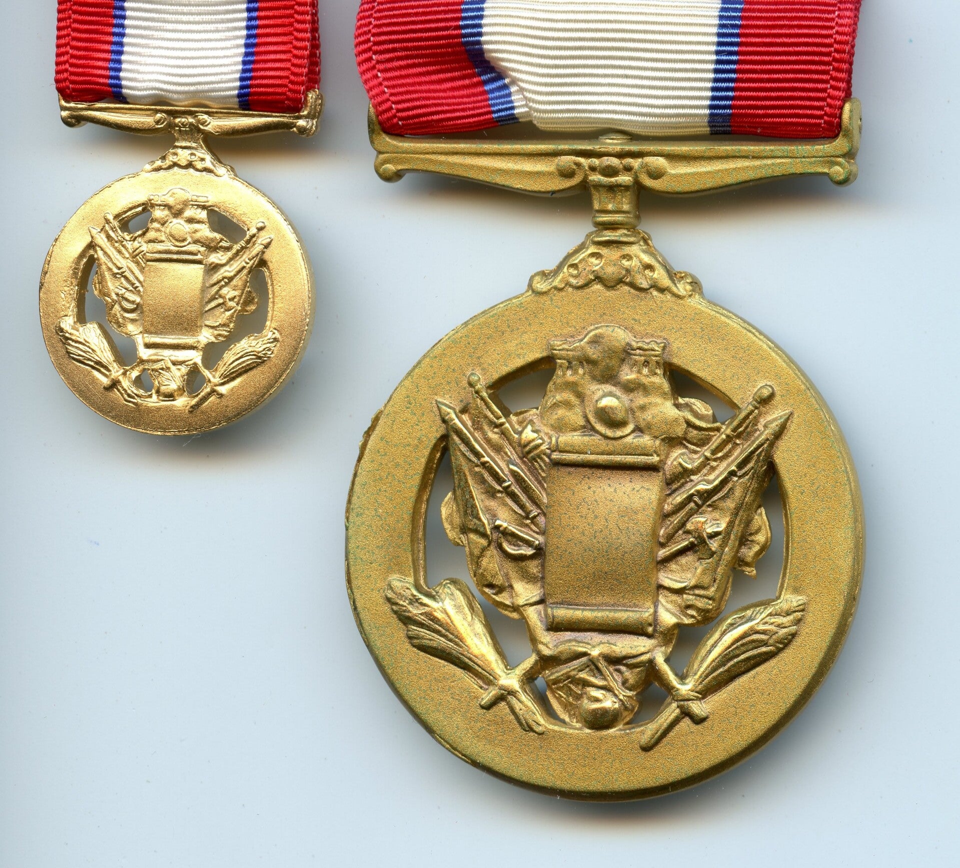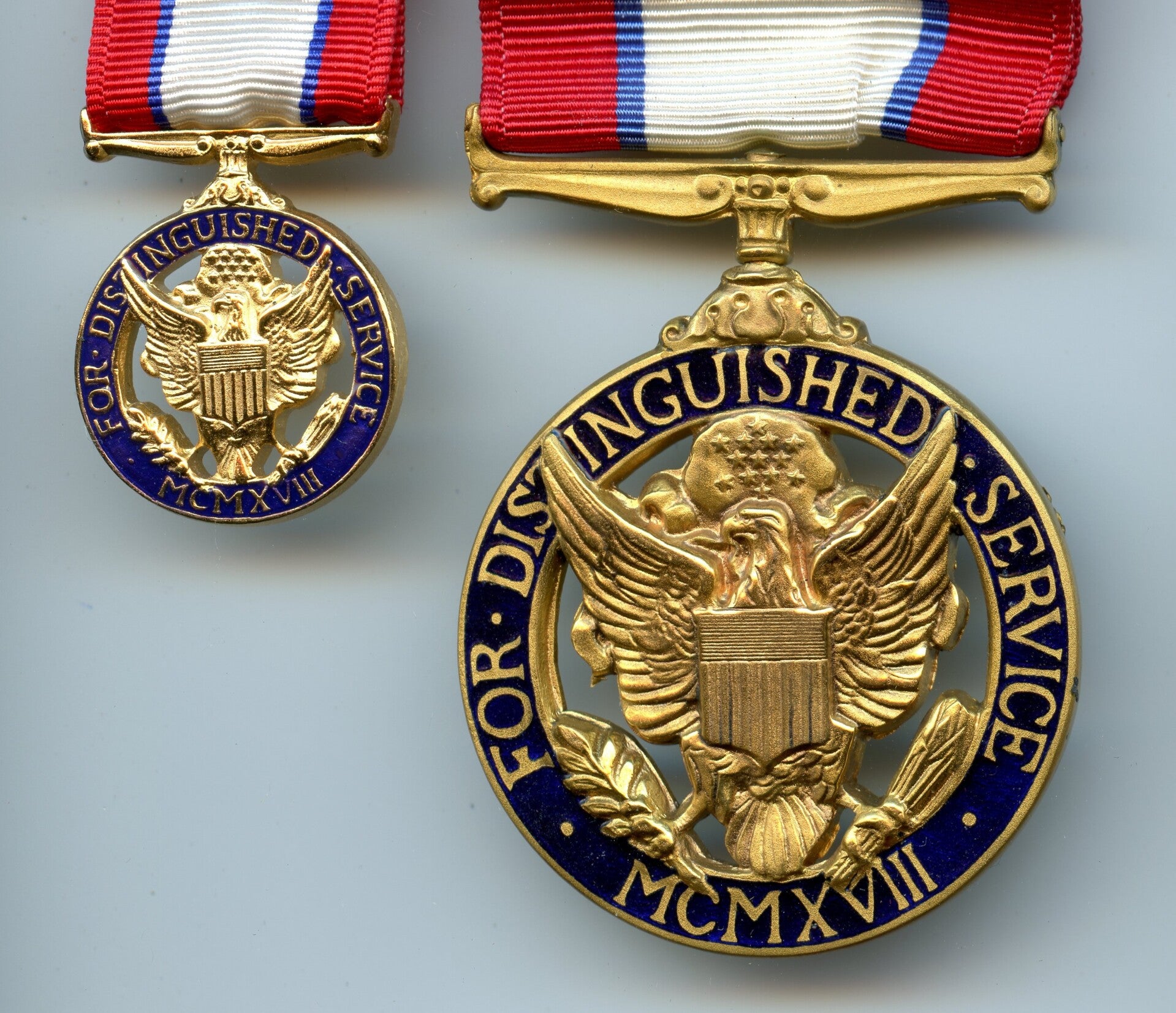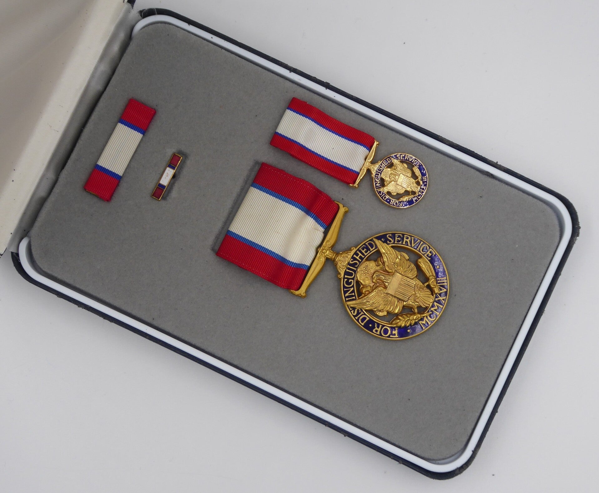 An original complete Vietnam Era cased Distinguished Service Medal. The medal comes in its original case of issue (which has some wear and tear) together with its miniature, ribbon bar and lapel pin. The medal comes with a period original crimp brooch mechanism. Great set in good condition! No repairs, no damage.