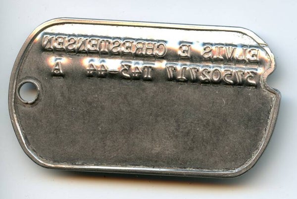Very nice WW2 Dog Tag. The tag is named to Elvis E Chrestensen (37502717). No research has been done on Chrestensen making this a nice research project. Nice interesting dog tag in great condition. No repairs, no damage.