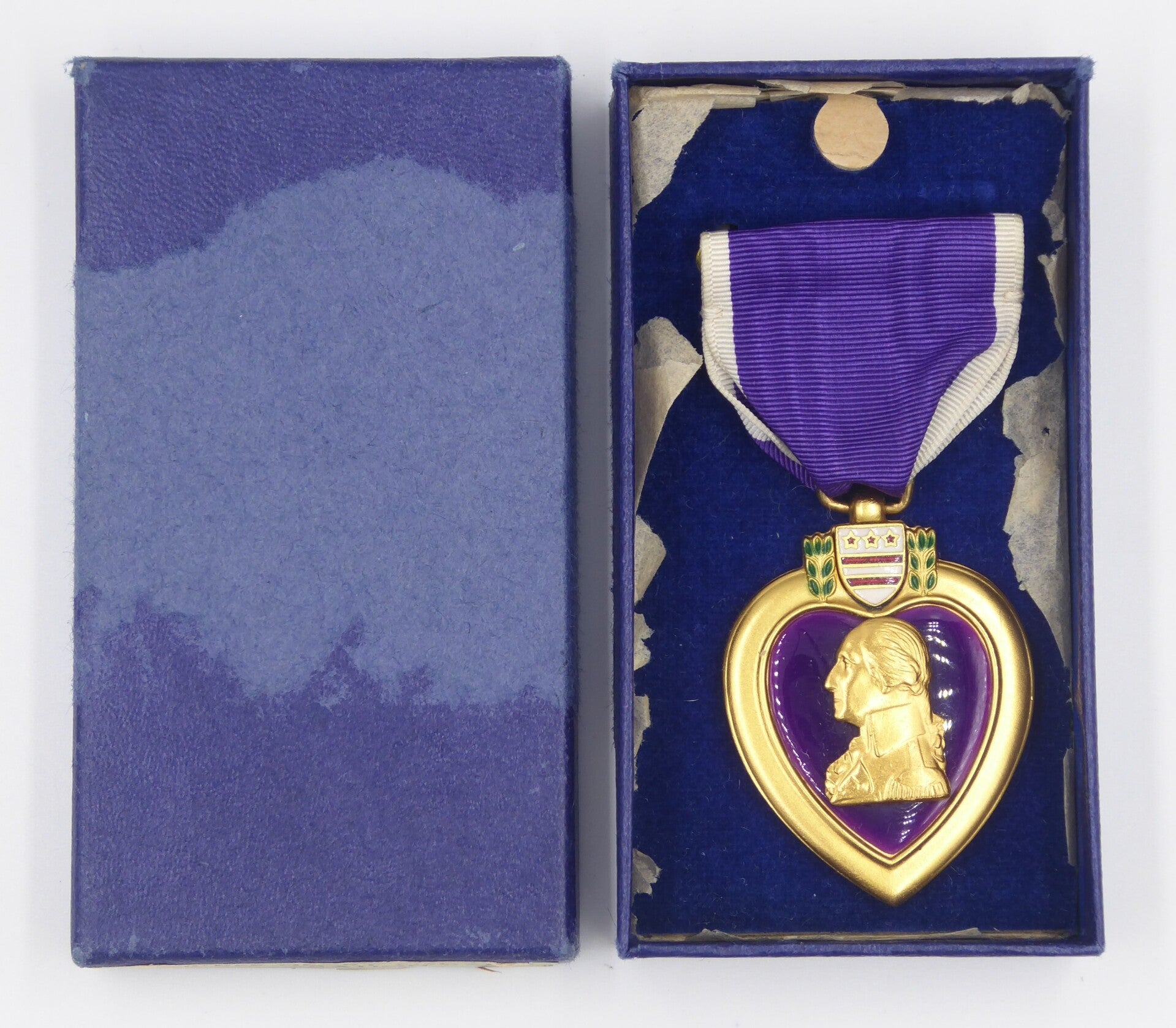 An original WW2 cased Purple Heart medal. The medal comes in its original blue carton case of issue. The medal comes with a slot brooch, indicating production during WW2. Great harder to find set in good condition! No repairs, no damage.