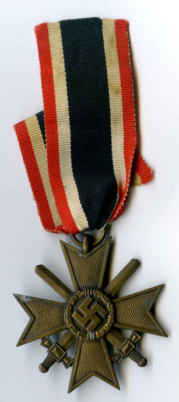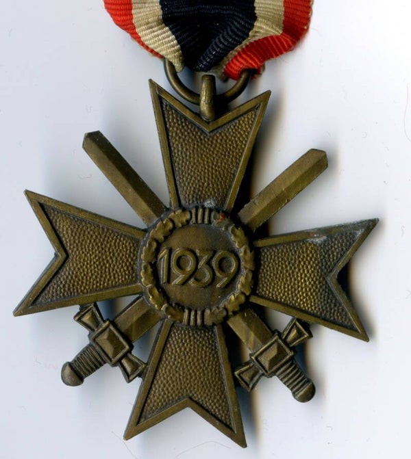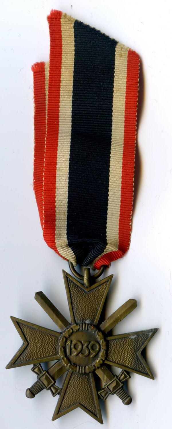 KVK 2nd Class with Swords, unmarked. Zinc construction. Nice cross in great worn condition, comes with its original long ribbon. Top cross! No repairs, no damage.