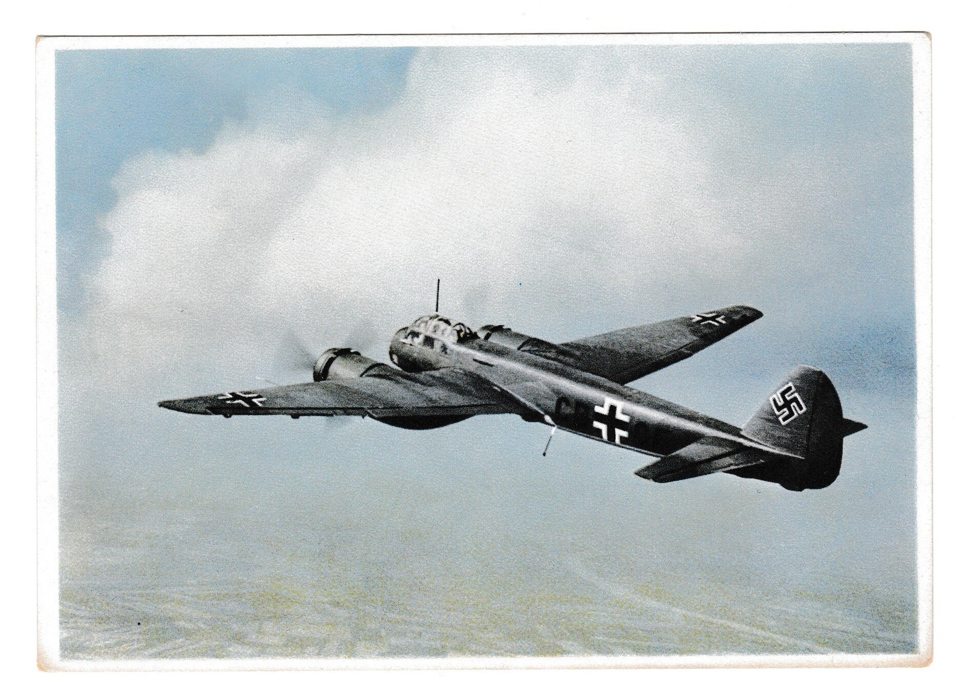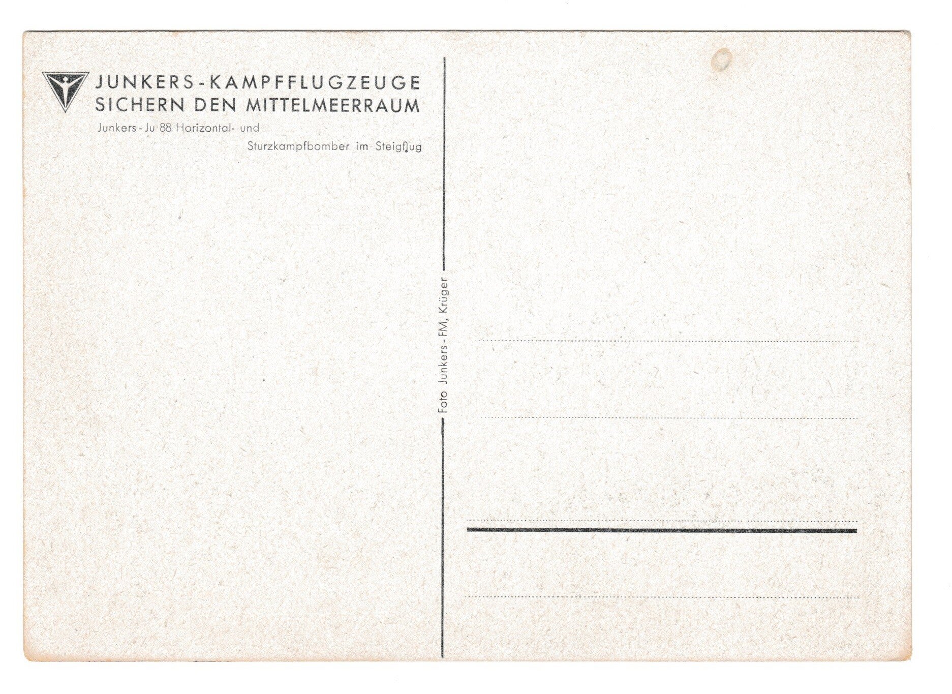 Nice postcard depicting an ascending Juncker Ju 88. The postcard is part of the series Junkers Kampfflugzeuge sichern den Mittelmeerraum. Very nice postcard in excellent condition and measures approximitely 15 x 10,5 cm in size. Great looking postcard! No repairs, no damage.