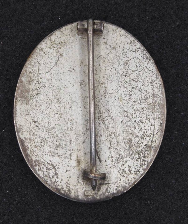 Nice worn silver wound badge by Gustav Brehmer, Markneukirchen. Buntmetall construction with a very nice amount of finish still left. The medal is marked on the bottom reverse with PKZ code "13" indicating production by Brehmer. The Badge has the typical Berhmer hardware. Nice badge in great condition. No repairs, no damage!