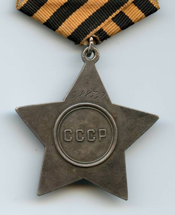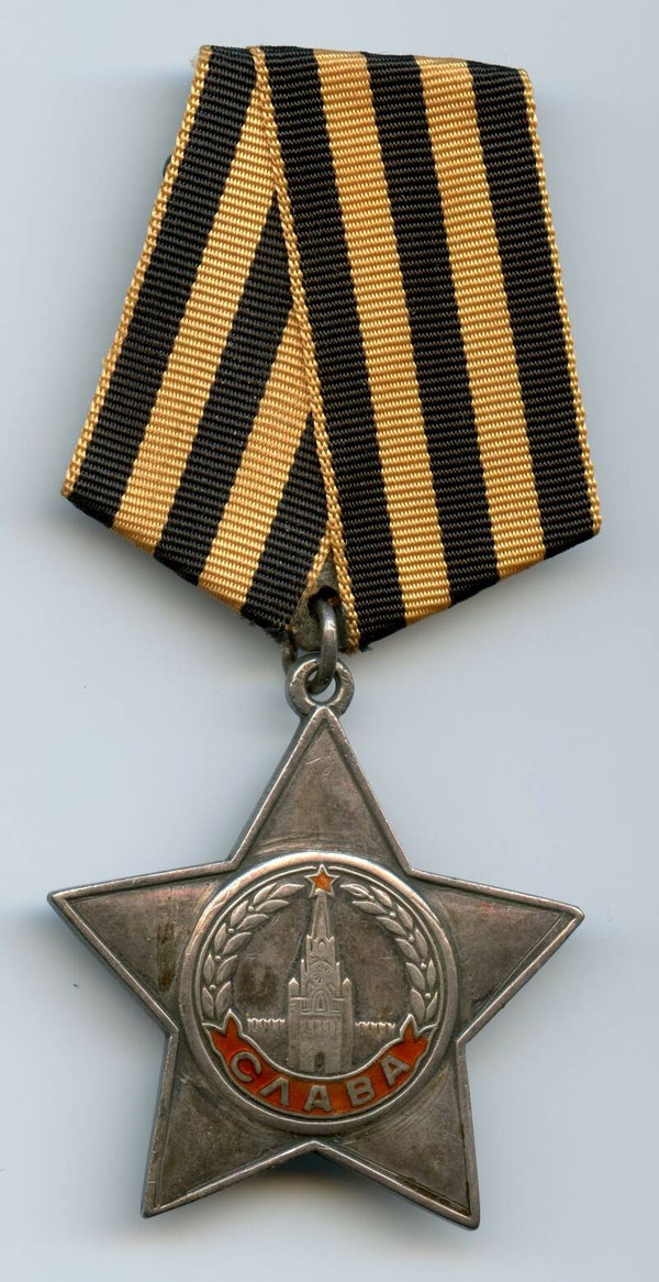 Very nice original Order of Glory 3rd class medal. The medal comes with its original ribbon and double steel suspension. The medal remains in a great condition and is serial numbered "588337". Very nice Order of Glory 3rd class medal with a great patina! No repairs, no damage.