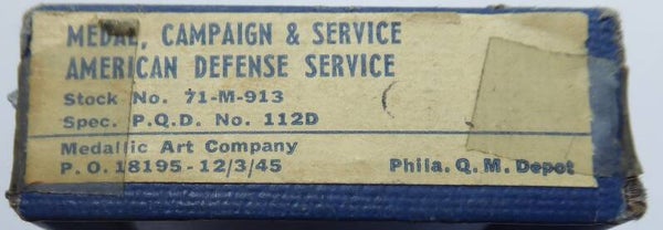 WW2 original Cased American Defense Medal. The medal comes in its original box of issue, which has some wear to it. Next to the medal, the box also contains the original wrapping paper. The medal has a slot brooch meganism and remains in an excellent near mint condition. Nice set! No repairs, no damage.