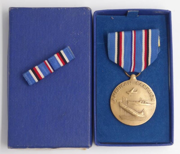 Nice WW2 original Cased American Navy Campaign Medal. The medal comes in its original blue box of issue and with its original ribbon bar, which remain in great condition. The medal comes with a crimp brooch mechanism. Great set! No repairs, no damage.