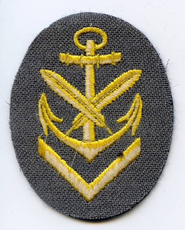 A very nice Kriegsmarine Senior Clerical NCO's Career Sleeve Badge (Schreiber Laufbahnabzeichen). The badge is made out of machine embroiderd cloth and remains in an excellent condition. The badge is black of colour as intended for the regular uniform. Excellent NCO career badge. No repairs, no damage.
