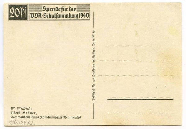 Nice Willrich postcard depicting Oberst Bräuer, Kommandeur eines Fallschirmjäger-Regimentes. These postcards were designed by the famous war artist Wolfgang Willrich. Very nice postcard in excellent condition and measures approximitely 15 x 10,5 cm in size. No repairs, no damage.