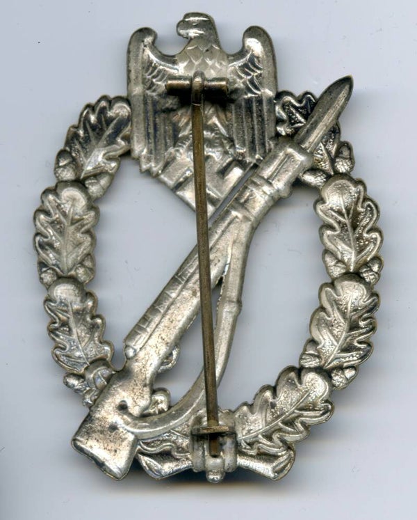 Beautiful silver infantry assault badge by Otto Schickle, Pforzheim. Tombac construction with soldered on hardware. The badge is in beautiful condition with most of its finish present. The badge is unmarked but a typical early war piece produced by Shickle. Beautiful badge in stunning condition! No repairs, no damage.