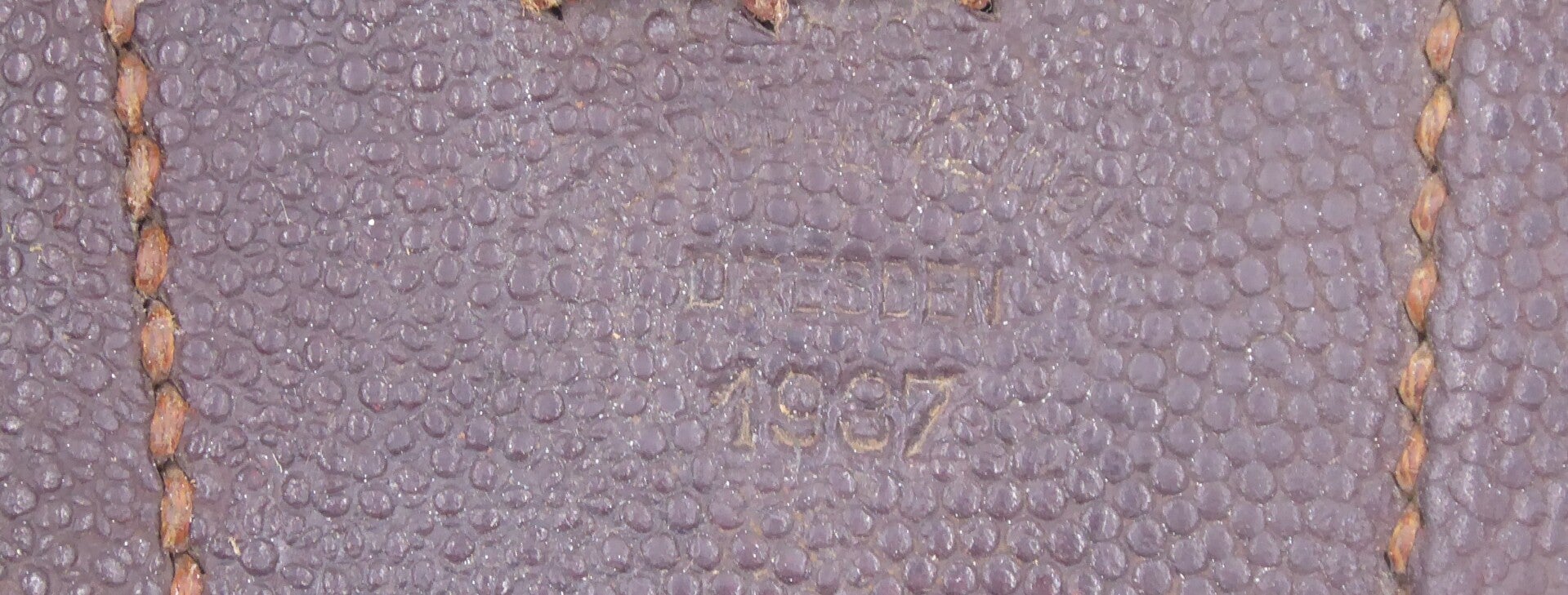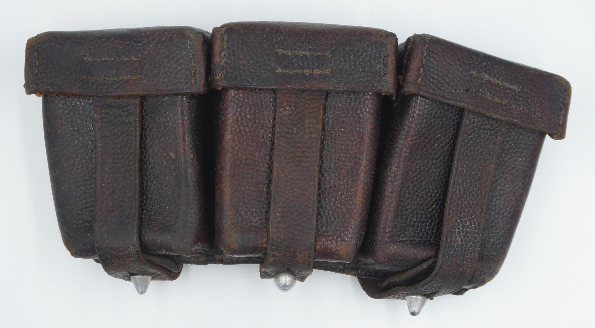 Nice original and complete Pre WW2 chocolate brown K98 Ammo Pouch by Gebrüder Klinge, Dresden. The ammo pouch is made from supple chocolate brown leather and is complete with all of its aluminum parts and partitions present. The ammo pouch has been maker marked on the reverse with "Gebrüder Klinge Dresden 1937". The ammo pouch also has an unit mark stamped in it as well. Nice original early K98 ammo pouch in great condition. No repairs, no damage.