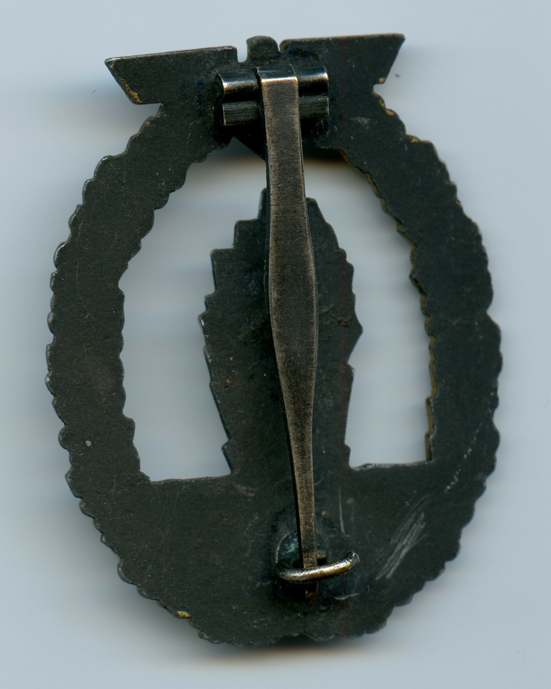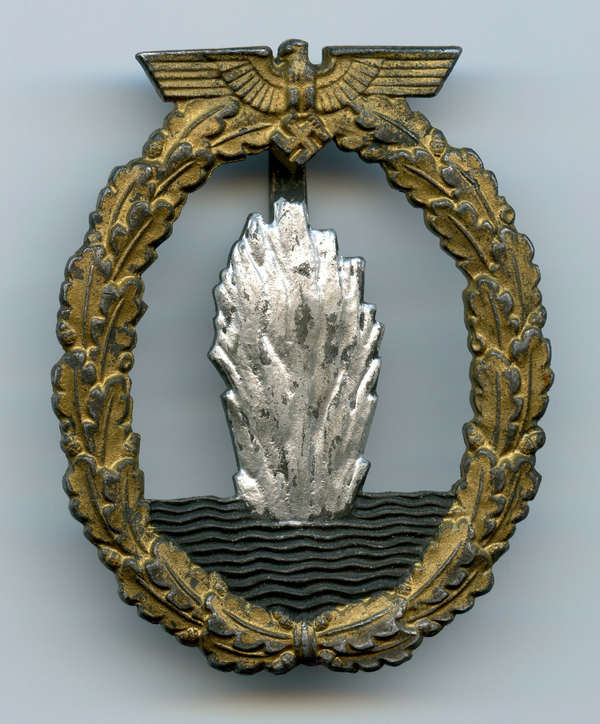 Excellent minesweeper badge produced by Paul Meybauer, Berlin. Zinc construction with soldered on hardware. The badge is unmarked but has the typical "Meybauer" setup. The badge has an excellent amount of finish still present for a zincer. Excellent Meybauer minesweeper badge. No repairs, no damage