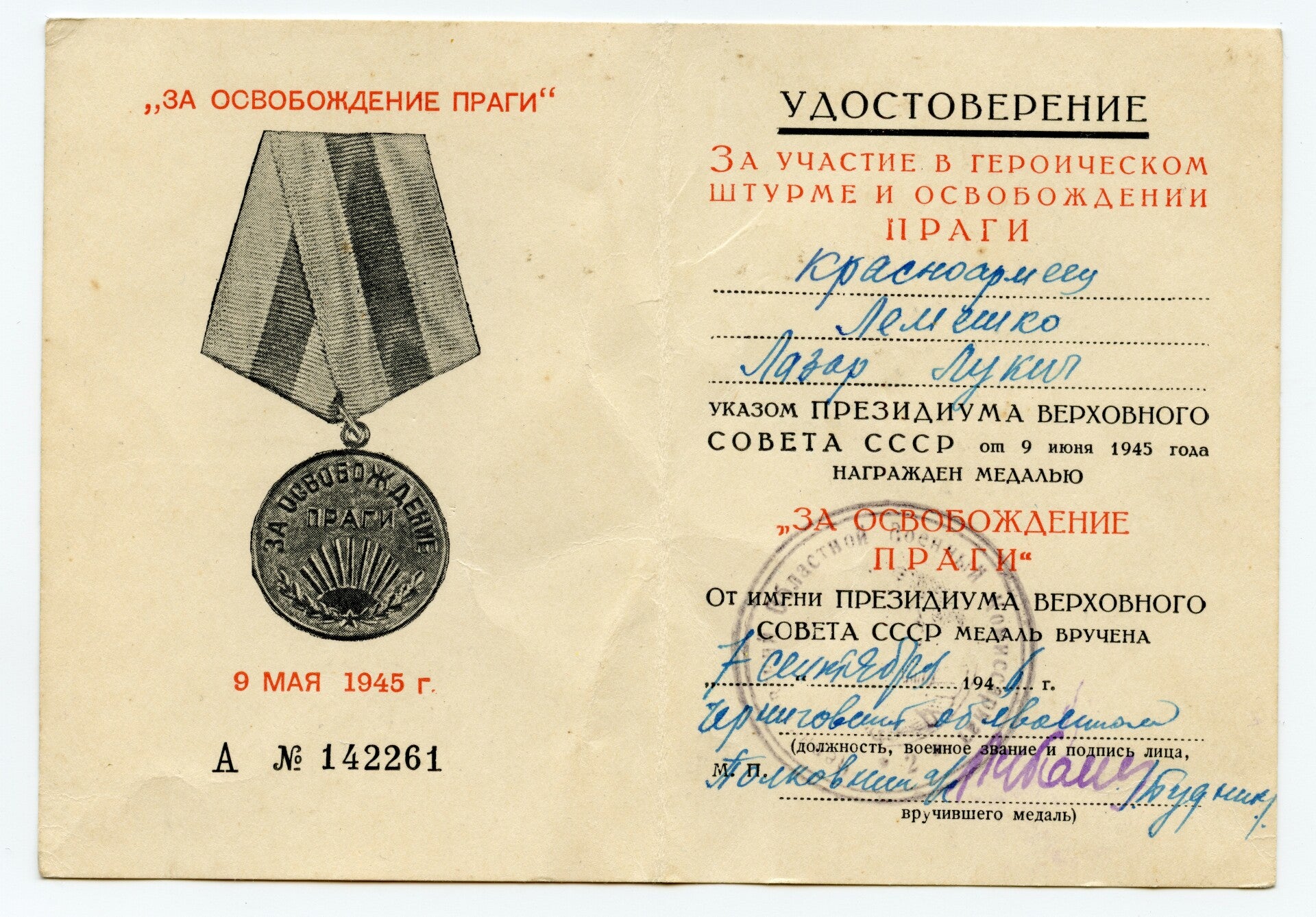 Very nice original medal for the Liberation of Prague with document. The medal comes with its original ribbon and double layer brass suspension. The medal is of the first type and remains in a great worn condition! Nice medal for the Liberation of Prague with no repairs, no damage. The document is numbered 142261 and awarded on the 17th of September 1946. The medal and document have been awarded to Red Army Soldier Lemeshko Lazar Lukich. Nice original document. Great one of a kind set!