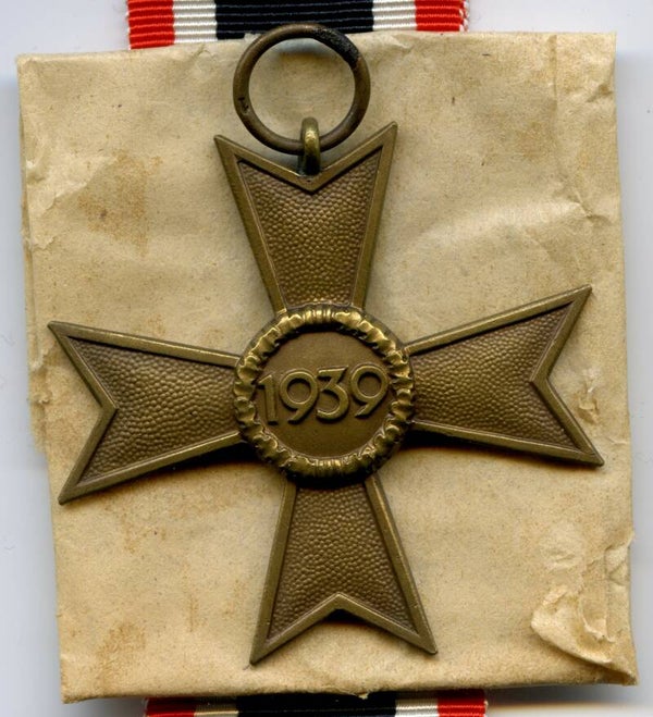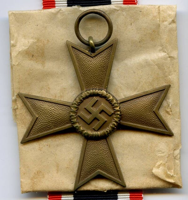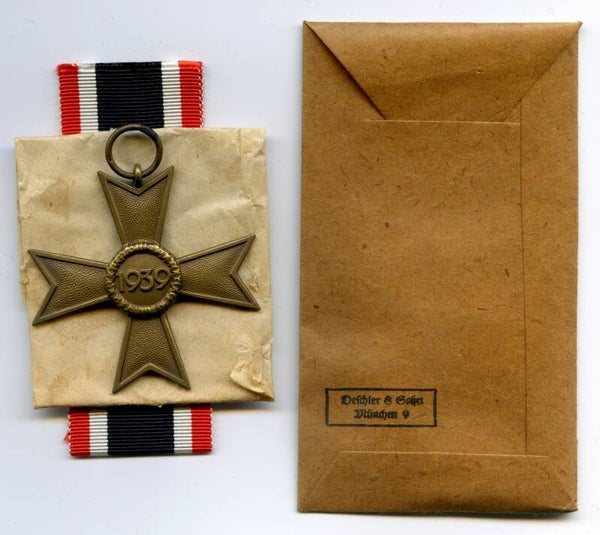 Nice and complete KVK 2nd Class without Swords by Deschler & Sohn, München. Buntmetall construction. The medal is marked on the ring with PKZ code "1" indicating production by D&S. Nice cross in mint unissued condition, comes with its original long ribbon, wrapping paper and maker marked package. This cross originates from the famous "Deschler Hoard". Nice original complete set with mint cross! No repairs, no damage.