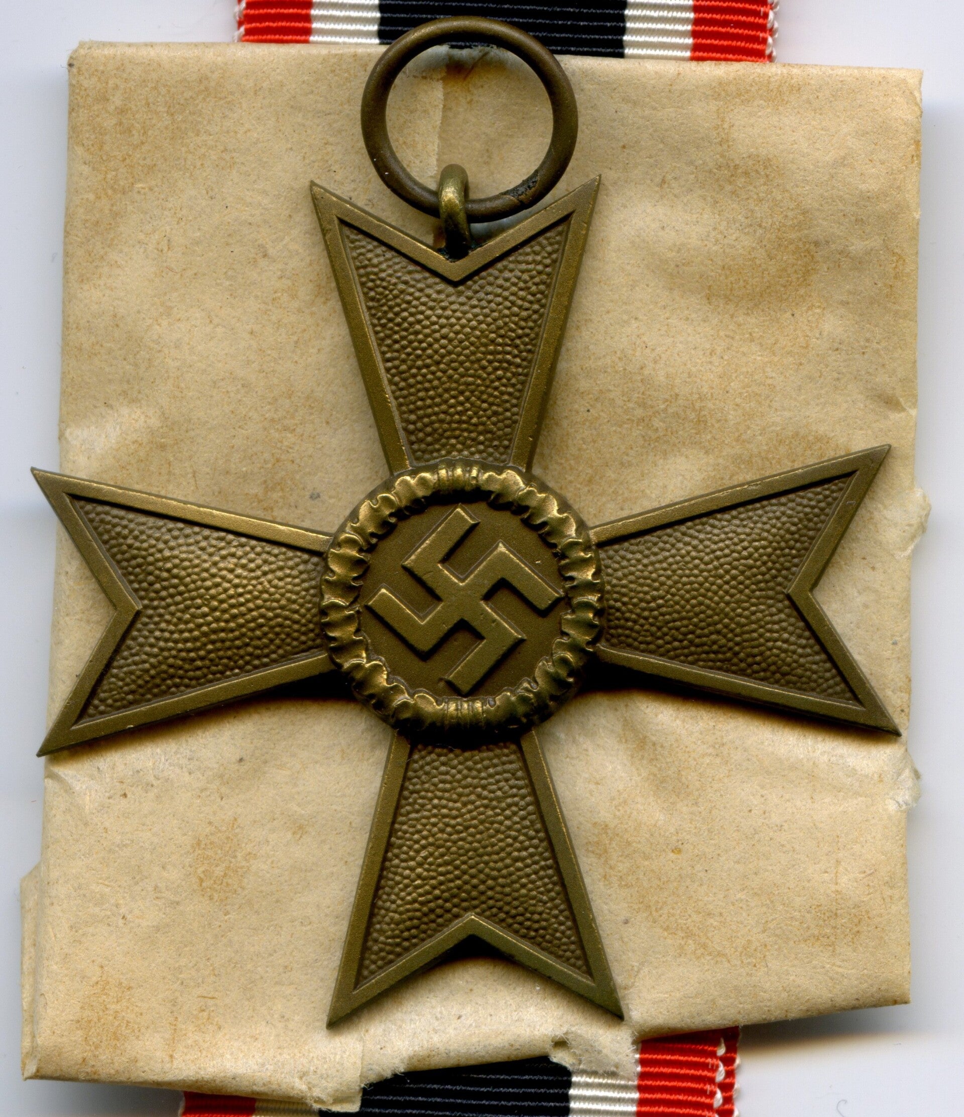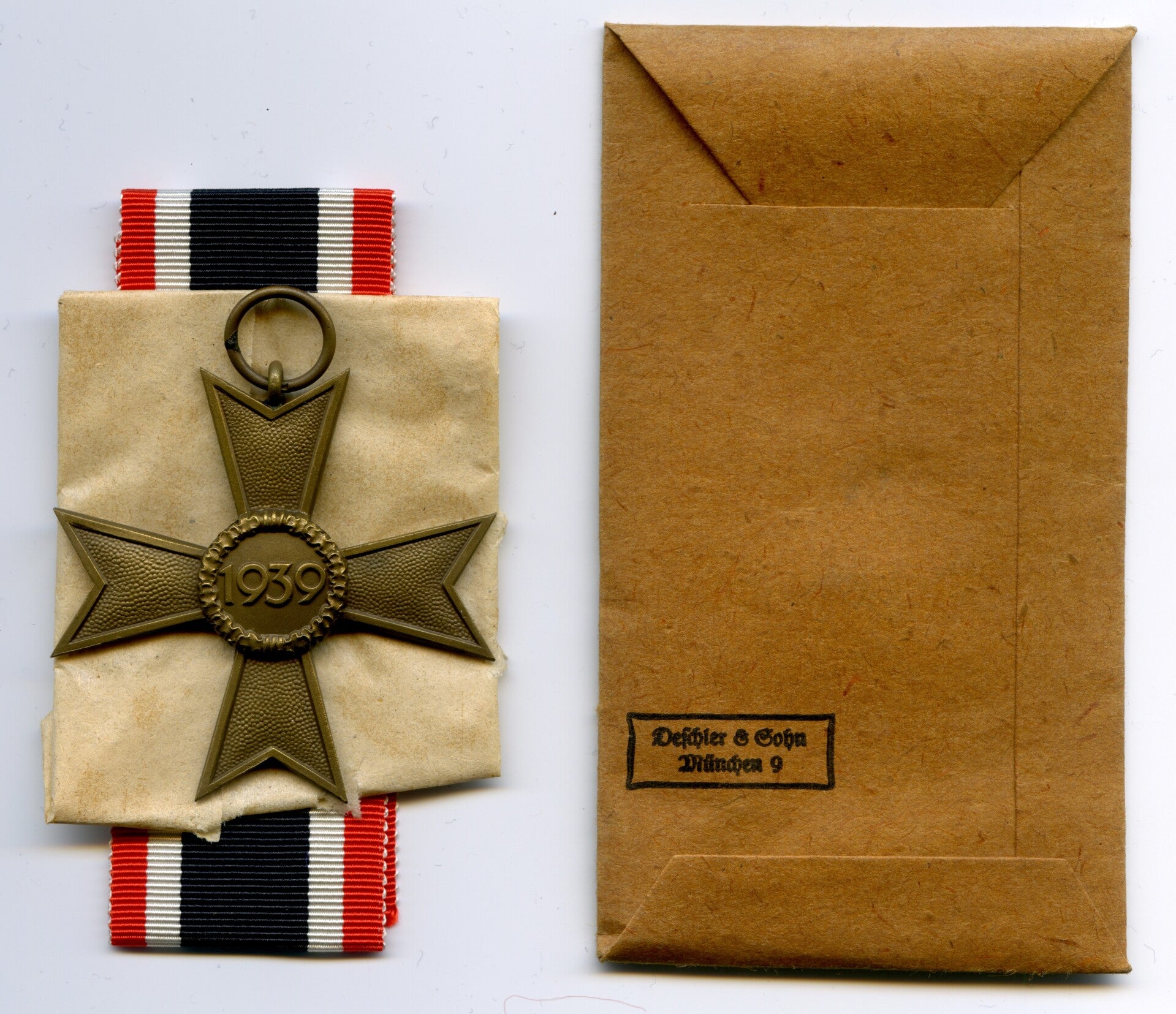 Nice and complete KVK 2nd Class without Swords by Deschler & Sohn, München. Buntmetall construction. The medal is marked on the ring with PKZ code "1" indicating production by D&S. Nice cross in mint unissued condition, comes with its original long ribbon, wrapping paper and maker marked package. This cross originates from the famous "Deschler Hoard". Nice original complete set with mint cross! No repairs, no damage.
