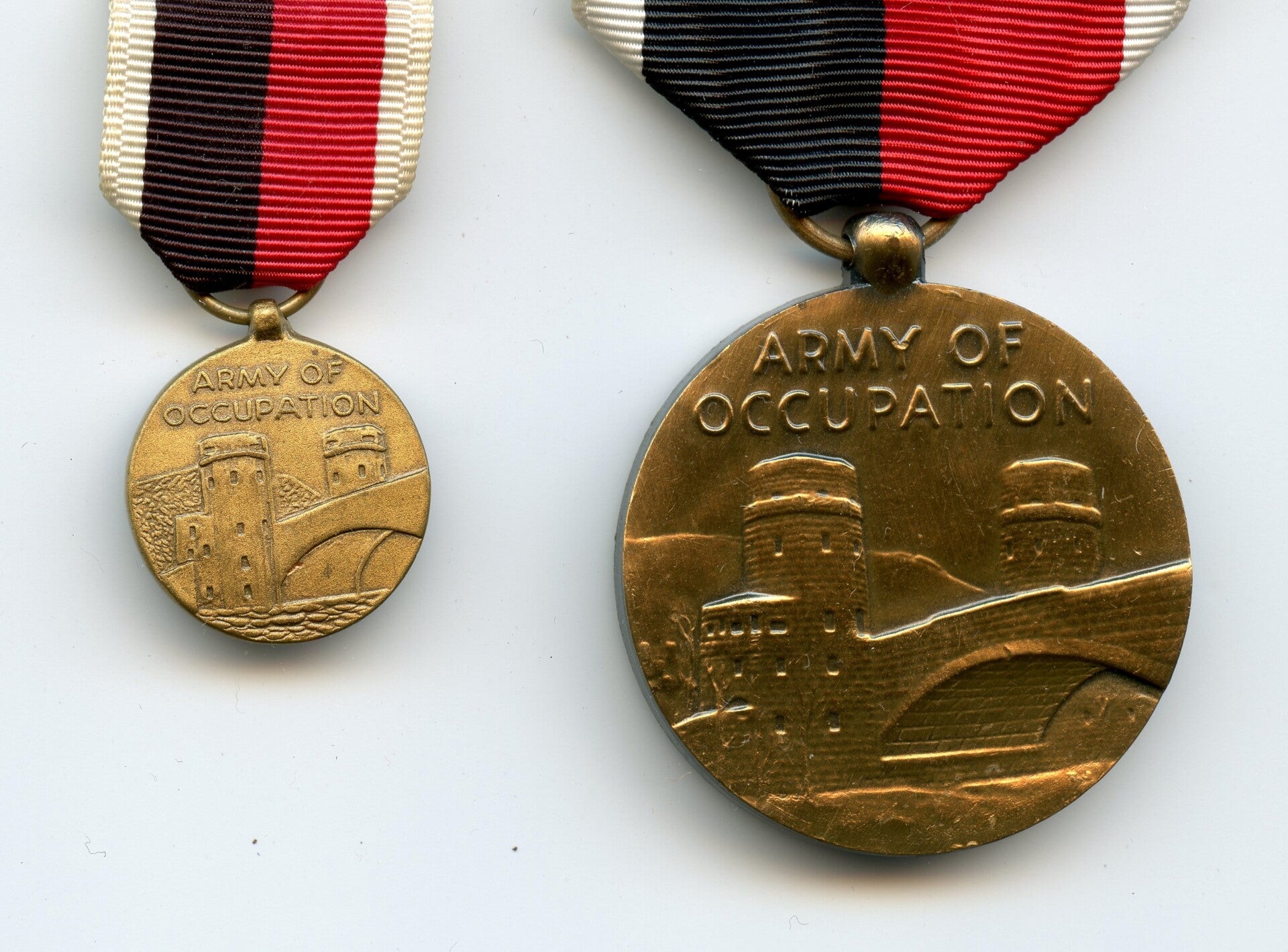 A nice original Post WW2 Occupation Medal with Miniature.The medal and miniature come with a crimp brooch, indicating post WW2 production.Very nice Occupation Medal with Miniature in near mint condition! No repairs, no damage.