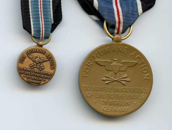 A nice original Post WW2 Medal for Humane Action (also known as the Berlin Airlift Medal) with Miniature.The medal and miniature come with a crimp brooch, indicating post WW2 production.Very nice Medal for Humane Action with Miniature in near mint condition! No repairs, no damage.