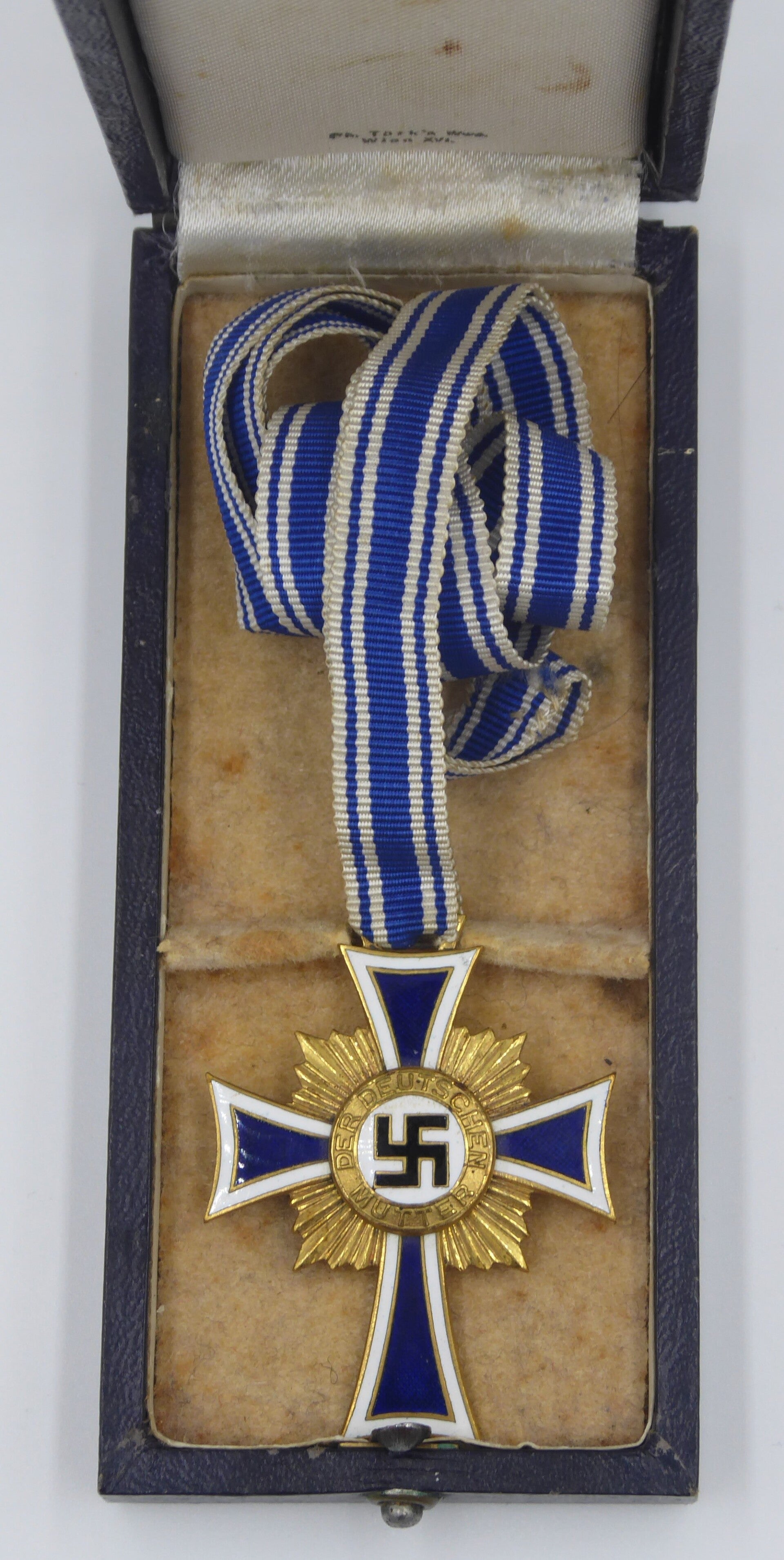 Very nice cased gold Mothers Cross produced by Philipp Türk's Witwe, Wien. The cross remains in an excellent near mint condition and comes with its original long ribbon. The box is in a very nice condition and shows some signs of age. The box is nicely maker marked with "Ph. Türk's Wwe. Wien XVI." indicating production by Philipp Türk's Witwe. Excellent and beautiful set of a harder to find maker! No repairs, no damage.