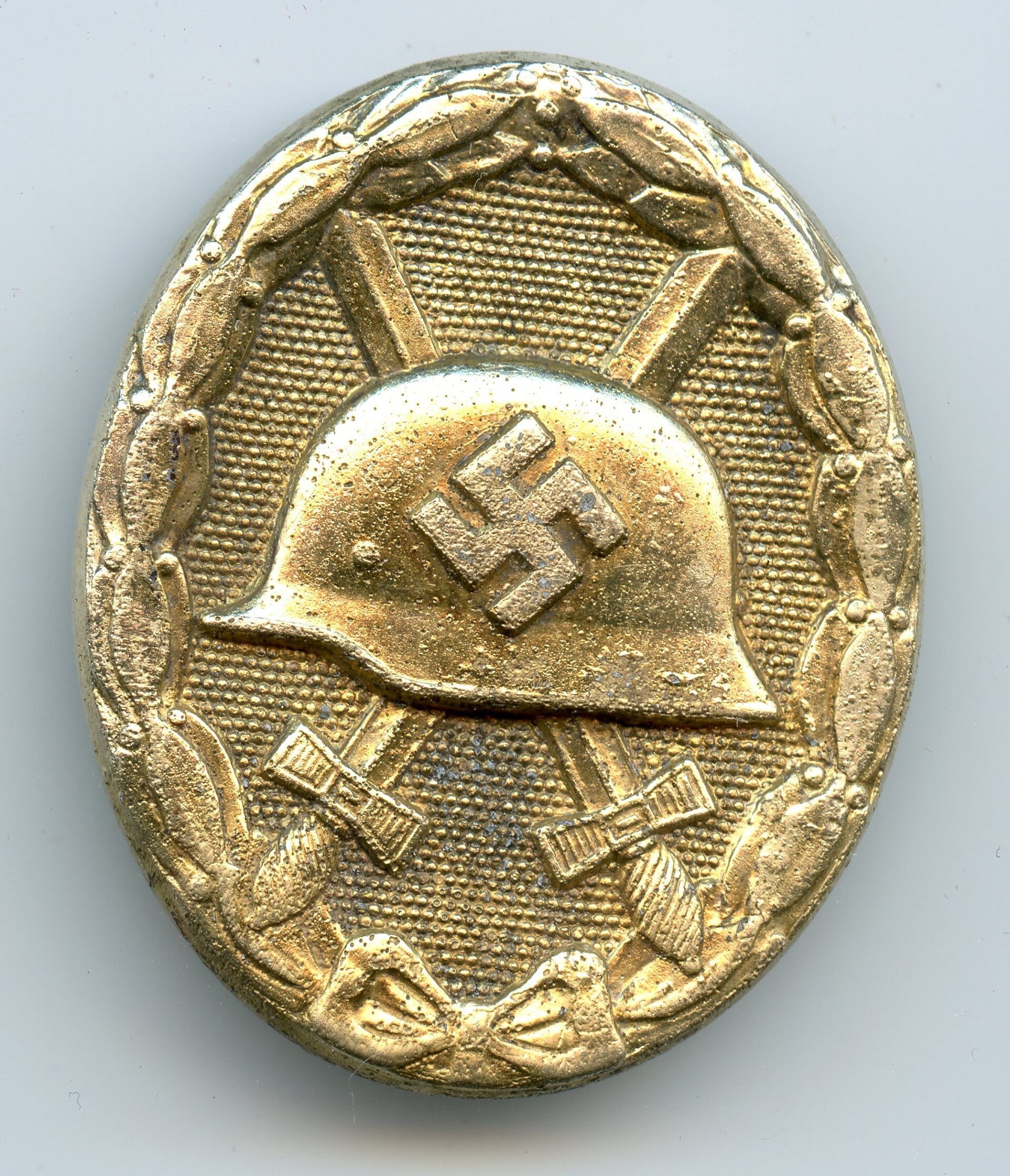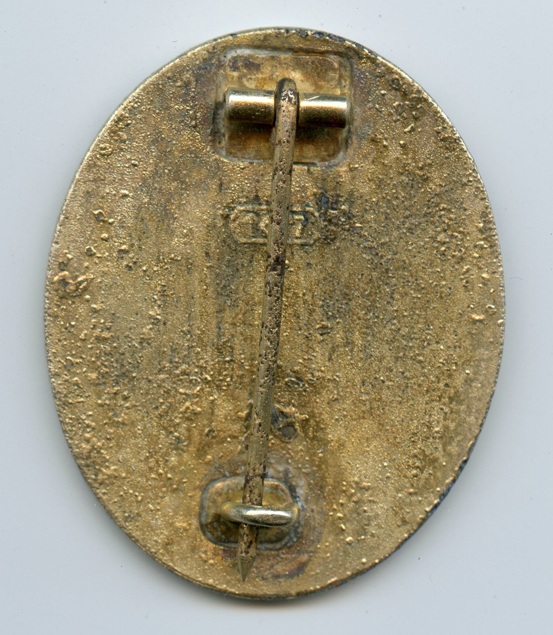 Beautiful worn gold wound badge by Carl Wild, Hamburg. Zinc construction with some great amount of gold finish still present. The medal is marked on the back with PKZ code "107" indicating production by Carl Wild. Badge has the typical Carl Wild hardware and zinc bubbling. Nice badge in great condition. No repairs, no damage!