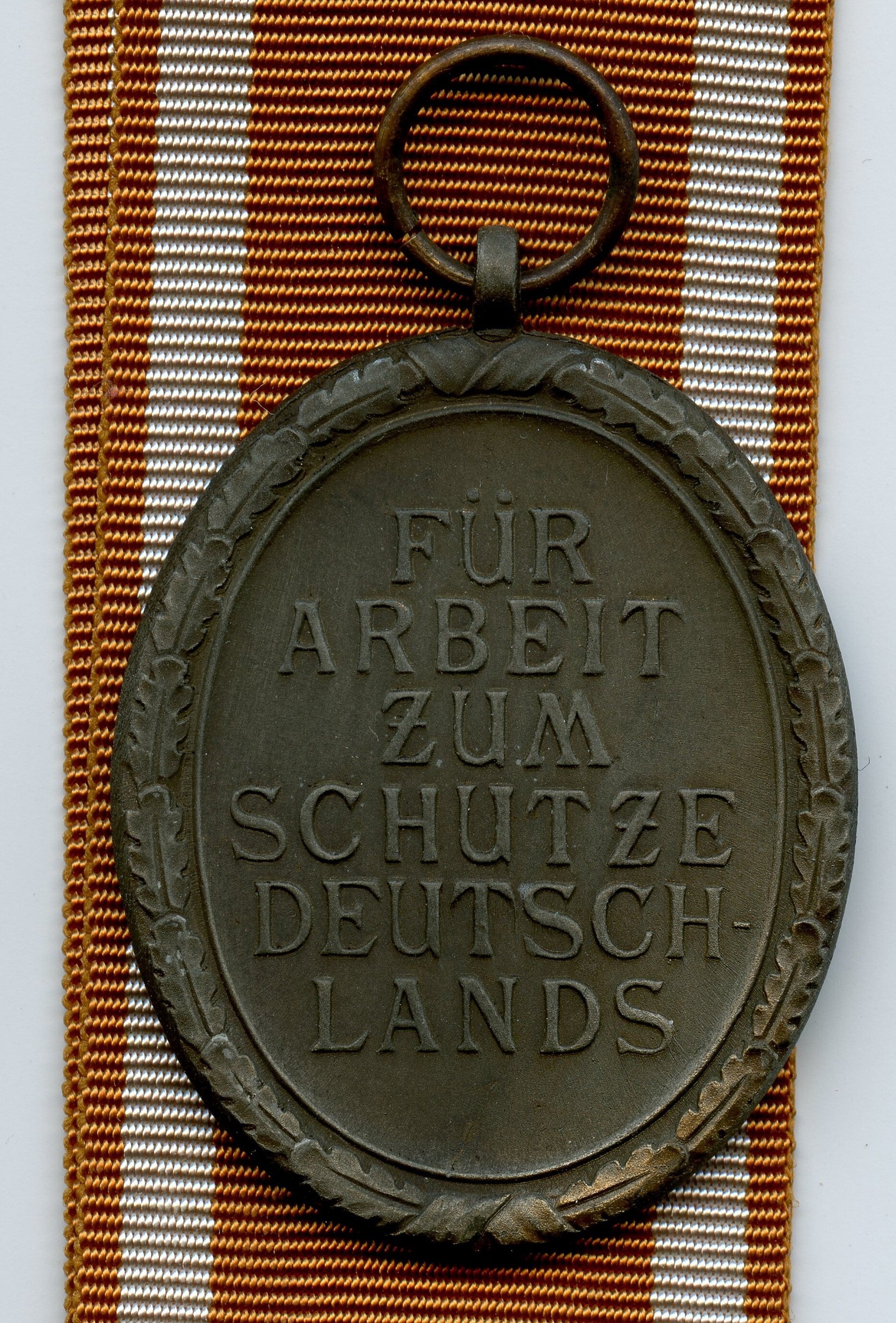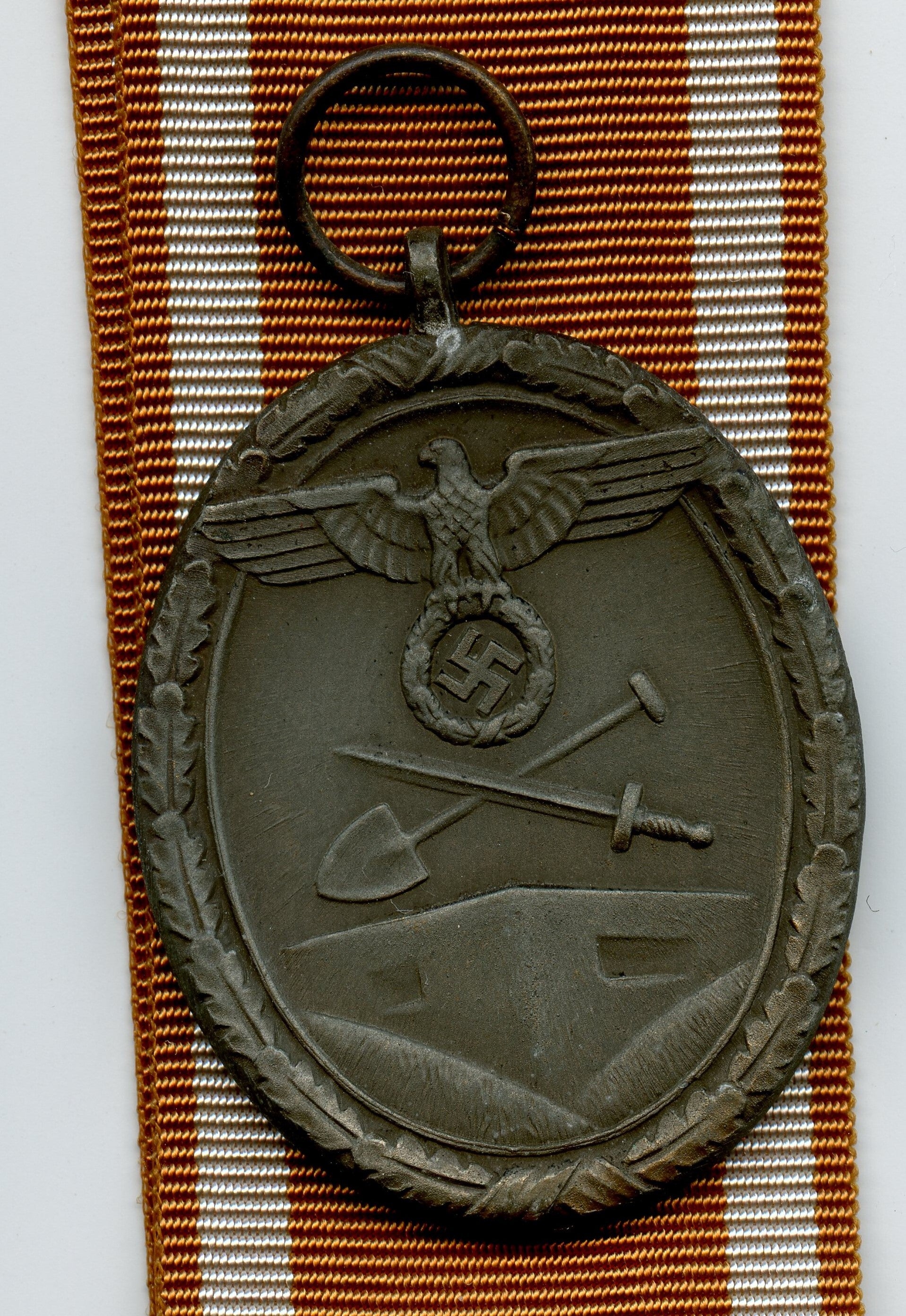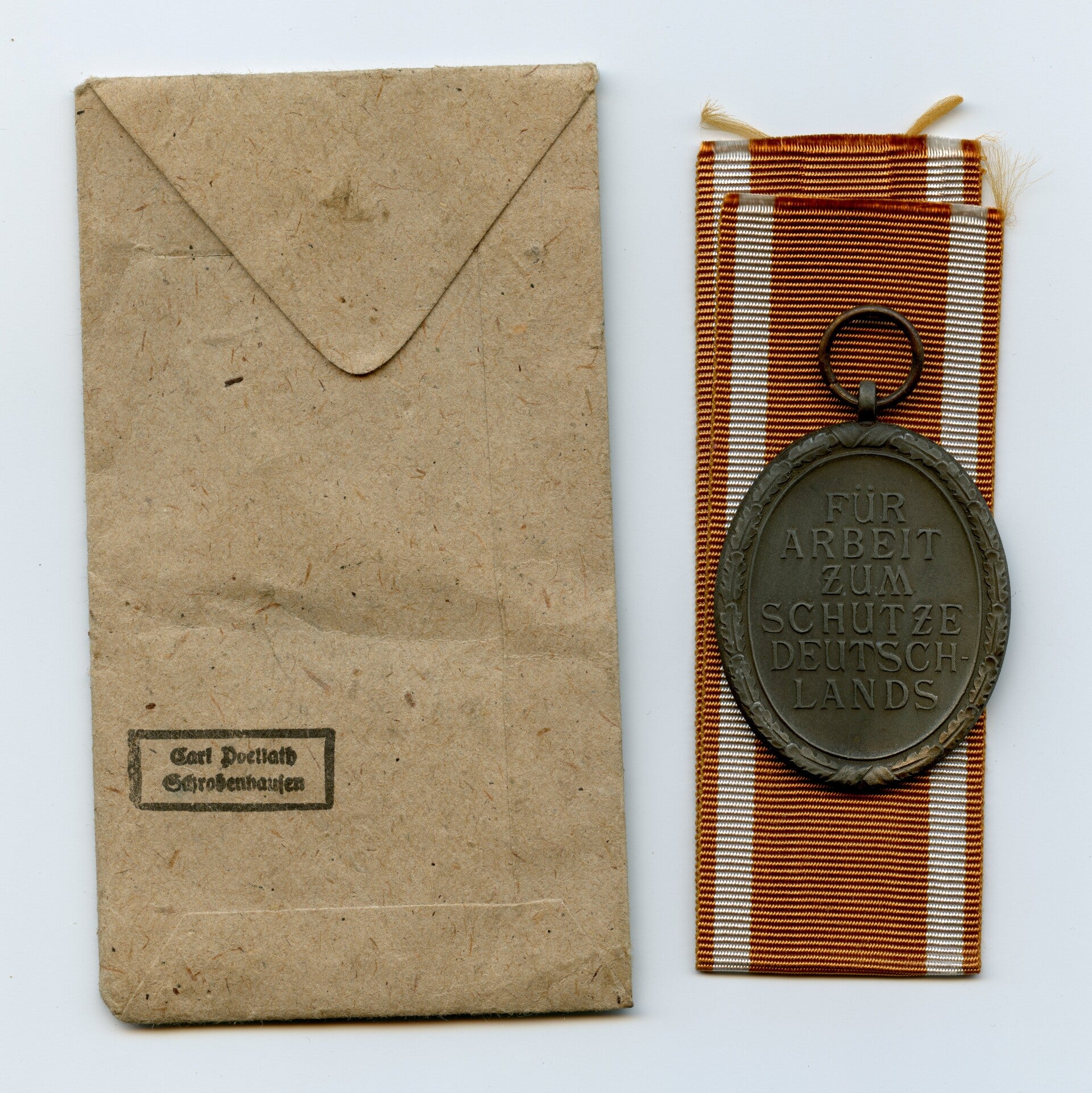 Nice Westwall medal. Zinc construction. Medal comes with its long ribbon and package by Carl Poellath, Schrobenhausen. Nice set in good condition. No repairs, no damage.
