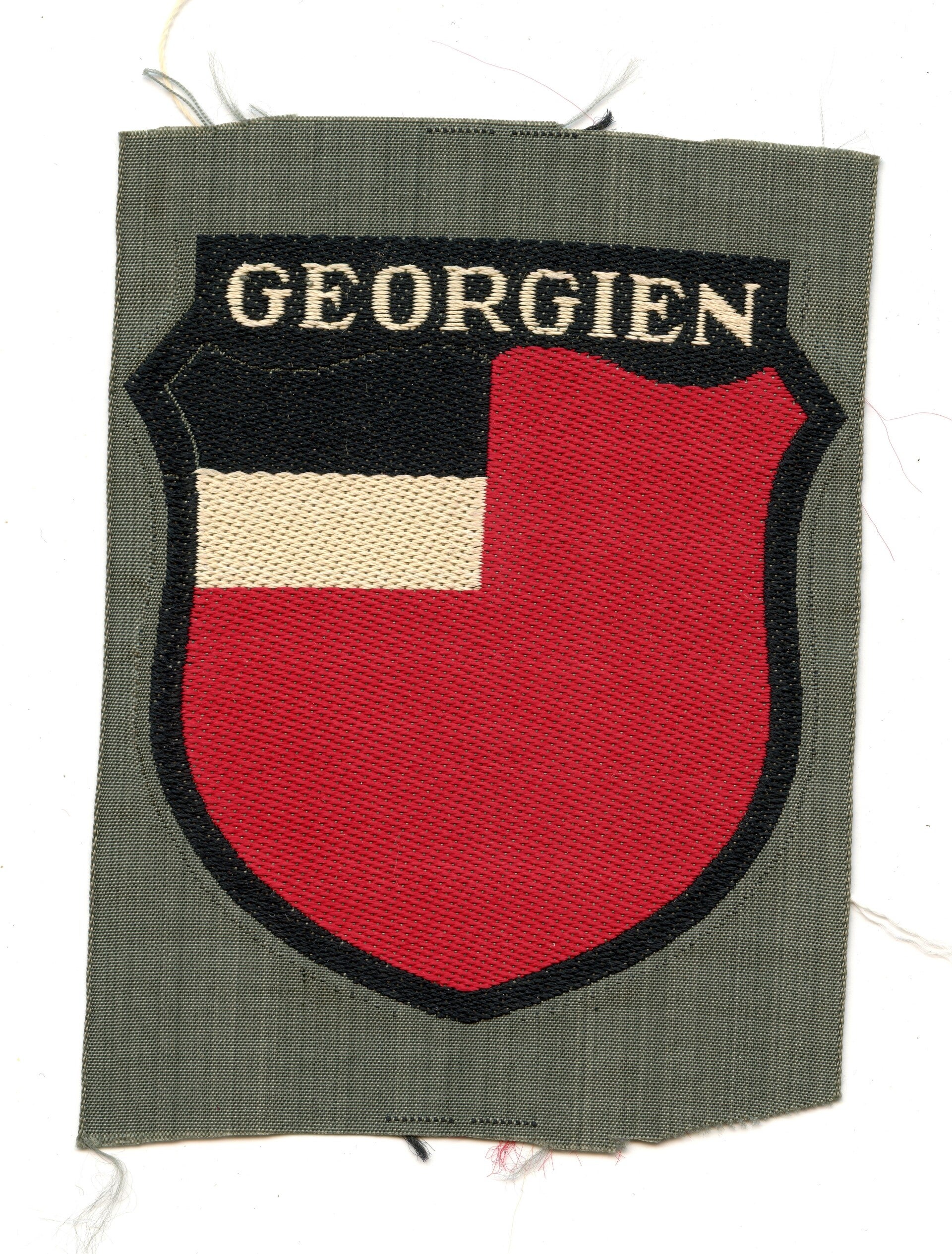 Very nice BeVo woven "Georgien" Volunteer Shield. The shield was worn by Georgean nationals whom served within the Georgien Legion. The shield remains in a mint and unissued condition. TOP PIECE! No repairs, no damage.