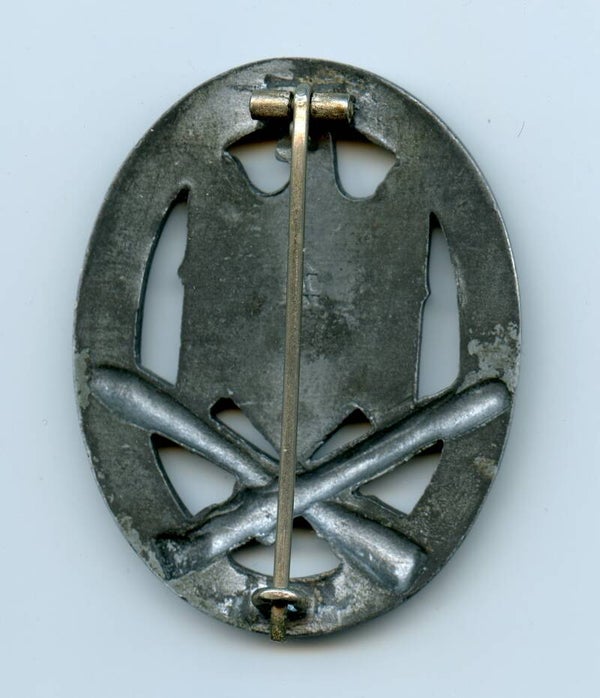 Nice silver General Assault Badge by F.W. Assmann & Söhne, Lüdenscheid. Zinc construction with soldered on hardware. The badge is maker marked on the reverse with the typical initial of Assmann "A" indicating production by Assmann & Söhne. The badge remains in a good condition with slightly faded silver/dark grey finish. Nice hard to find Assmann general assault badge in good condition. No repairs, no damage.