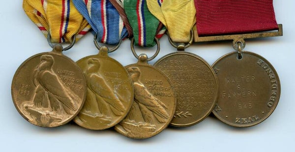 Excellent WW2 Original Named US Navy Medal Bar to Walter S. Farmer (The "N" at the end is incorrectly engraved). The Navy Good Conduct medal is also engraved and dated "1943" below the name. Farmer served on multiple vessels in both the European Theater and Pacific Theater of War. The medal bar is sewn together and was intended to be worn. The medal bar consists of the following medals: