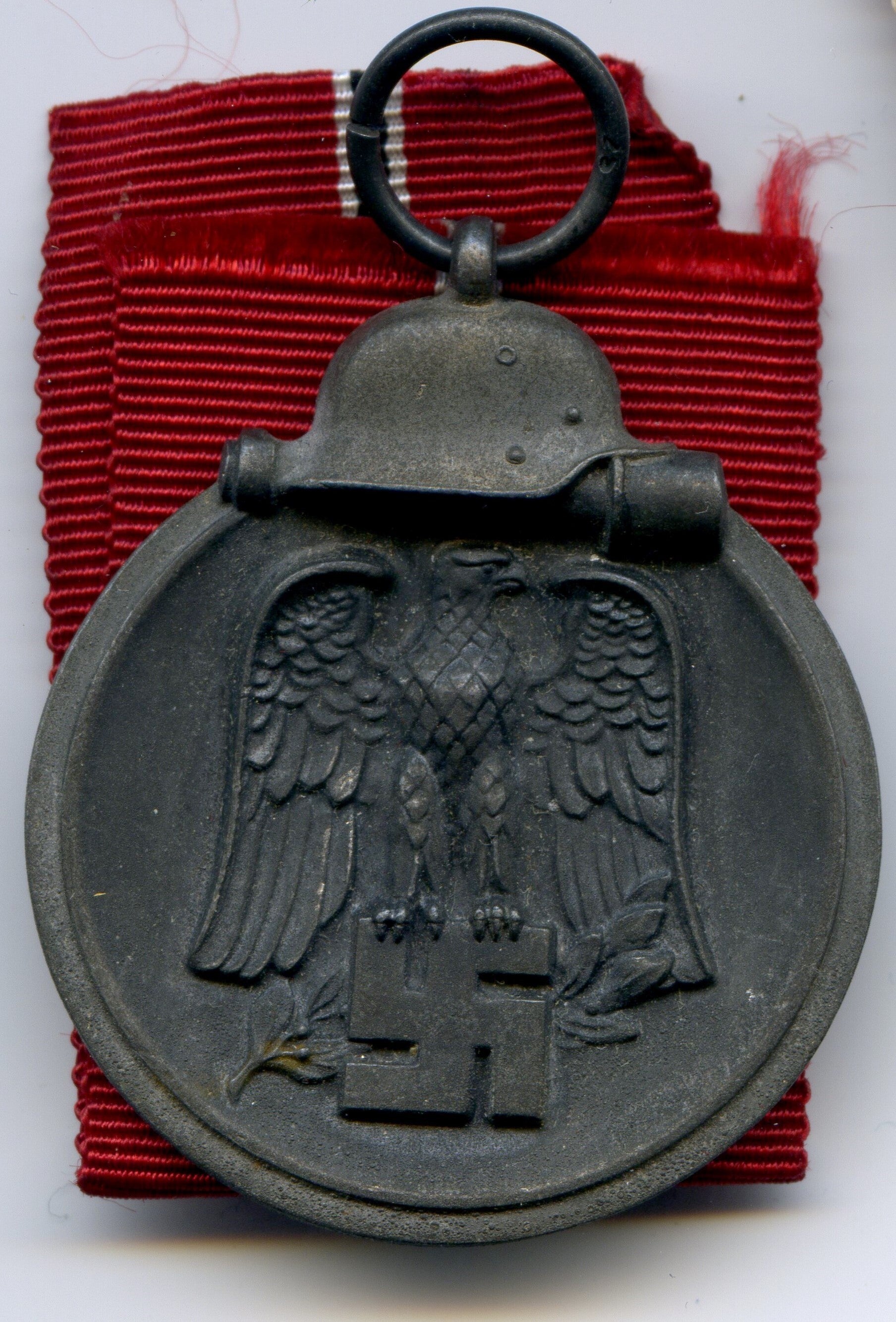 Nicely worn East Front medal by Arbeitsgemeinschaft der Graveur-, Gold- und Silberschmiede-Innung, Hanau am Main. Zinc construction. The medal is marked on the ring with PKZ code "25" indicating production by Arbeitsgemeinschaft der Graveur-, Gold- und Silberschmiede-Innung. The medal has lost most of its original finish. Nice medal in good condition, comes with its original long ribbon. No repairs, no damage.