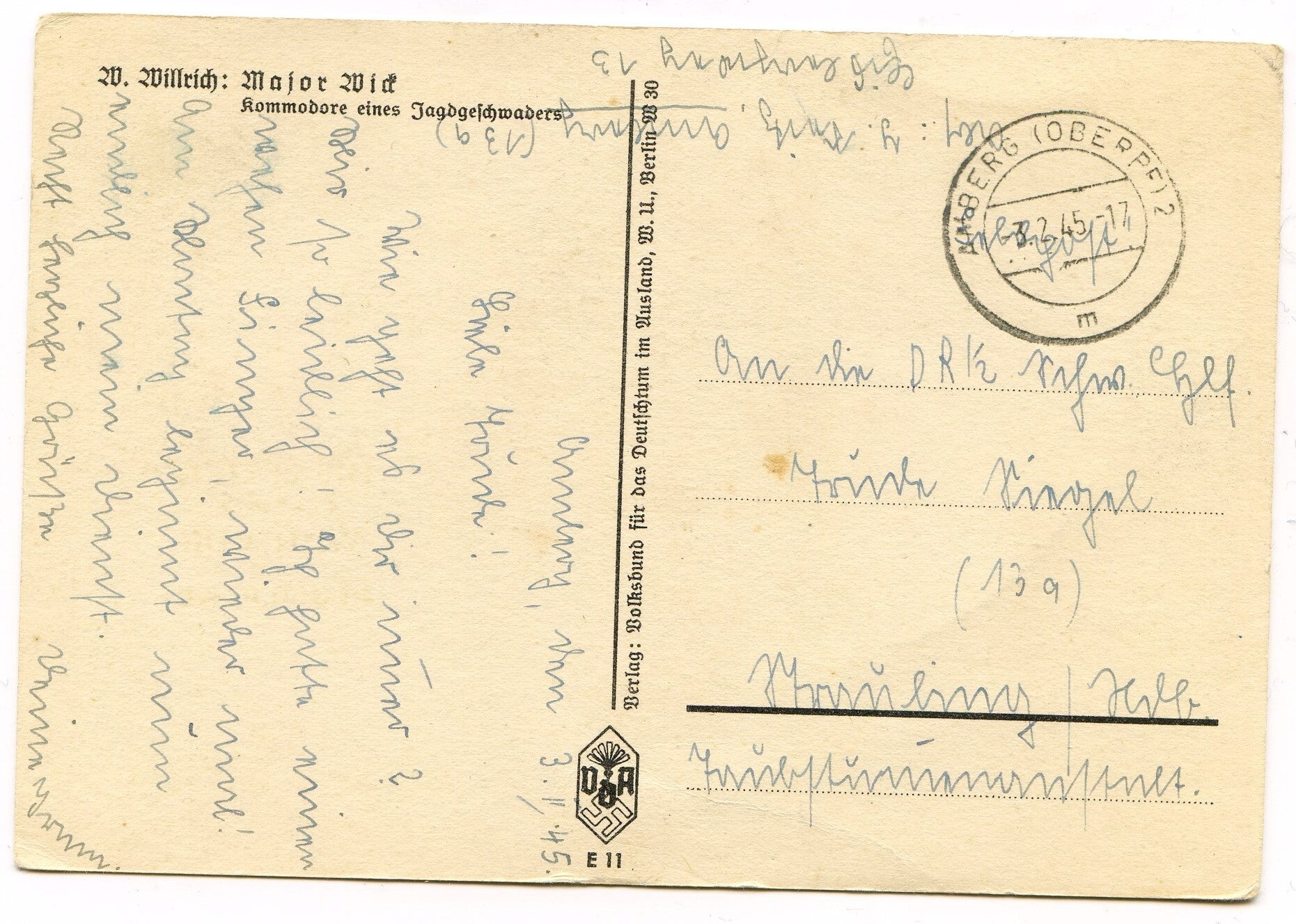 Nice Willrich postcard depicting Kommodore eines Jagdgeschwaders Major Wick. These postcards were designed by the famous war artist Wolfgang Willrich. Very nice postcard in excellent condition and measures approximitely 15 x 10,5 cm in size. No repairs, no damage.